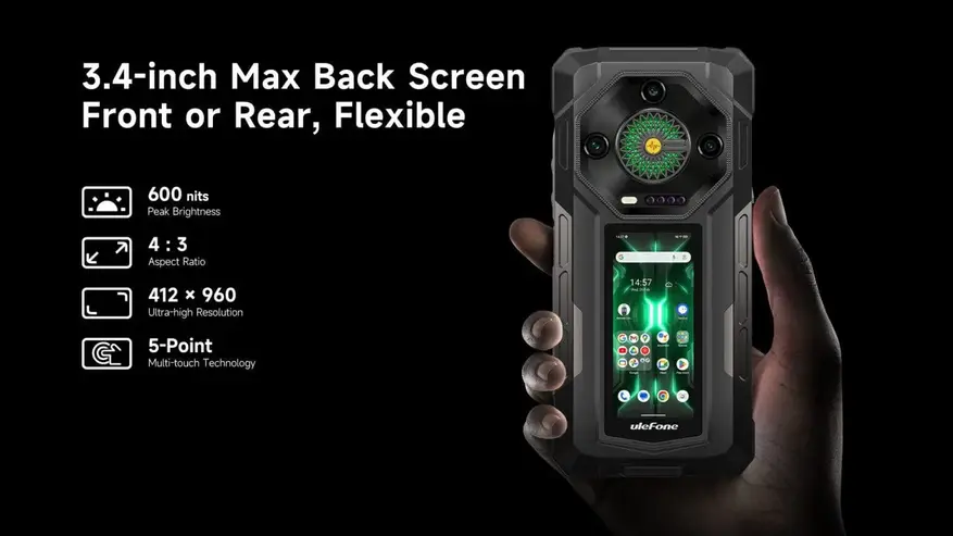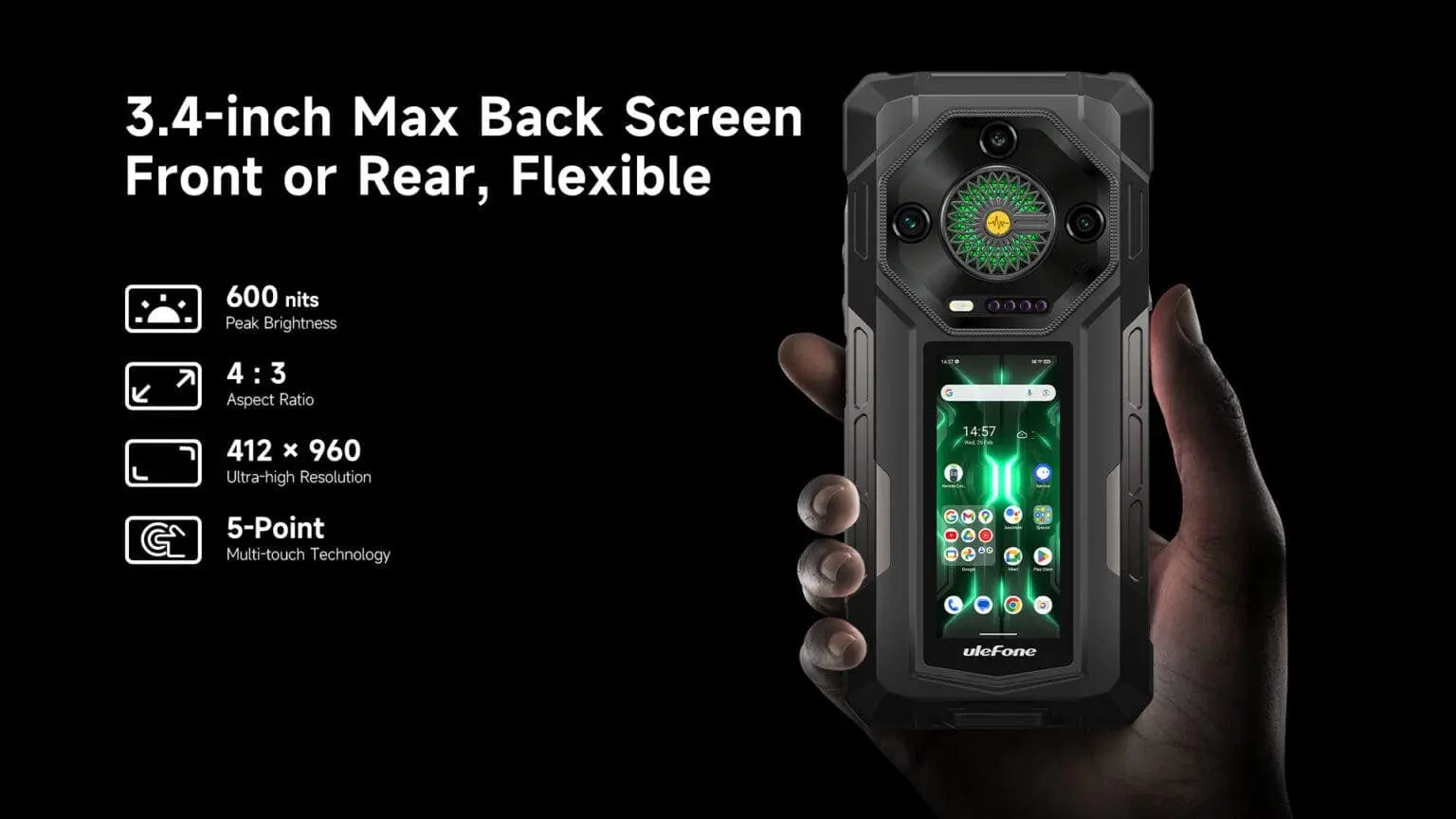 Armor 33 Pro оснащен дополнительным 3,4-дюймовым сенсорным экраном на задней панели, позволяющим быстро проверять уведомления или управлять музыкой без переворота устройства. Смартфон построен на процессоре MediaTek Dimensity 7300X (2,5 ГГц, 4-нм техпроцесс) с 16 ГБ оперативной памяти LPDDR5 и 512 ГБ хранилища UFS 3.1. Основная камера включает 50-МП сенсор, 64-МП модуль ночного видения и 50-МП ультраширокоугольный макрообъектив. Динамик с аудиоподсистемой объемом 9 см3 обеспечивает громкость до 118 дБ, а подсветка Halo добавляет визуальные эффекты.
