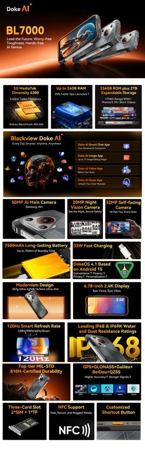 16 апреля 2025 — Компания Blackview анонсировала новый rugged-смартфон Blackview BL7000. Устройство соответствует военному стандарту MIL-STD-810H и обладает сертификацией водонепроницаемости IP68/IP69K, что позволяет погружать его в воду на глубину до 1,5 метров.