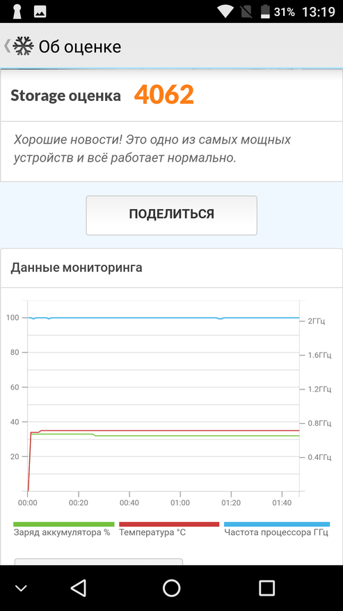 Скорость работы в обычных приложениях тоже неплохая. Давайте посмотрим, что там с ней. Скорость чтения встроенной флеш-памяти, кстати, тоже неплоха.