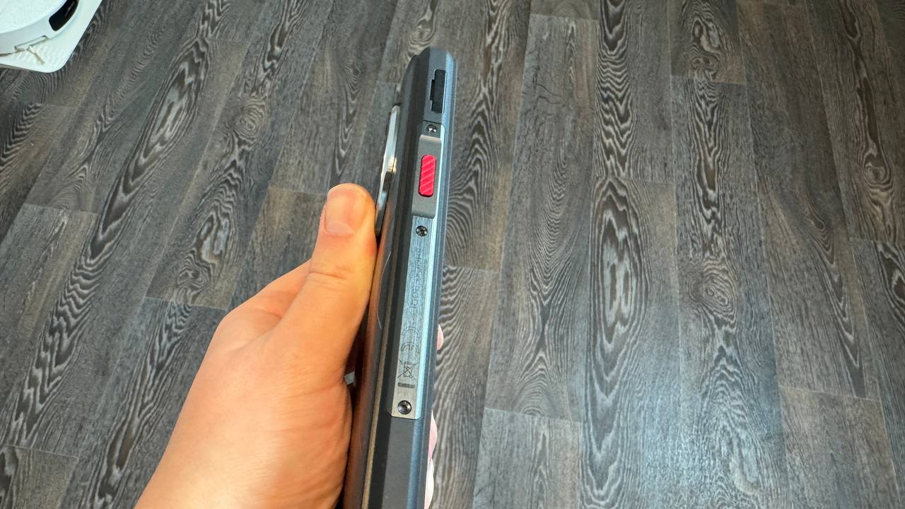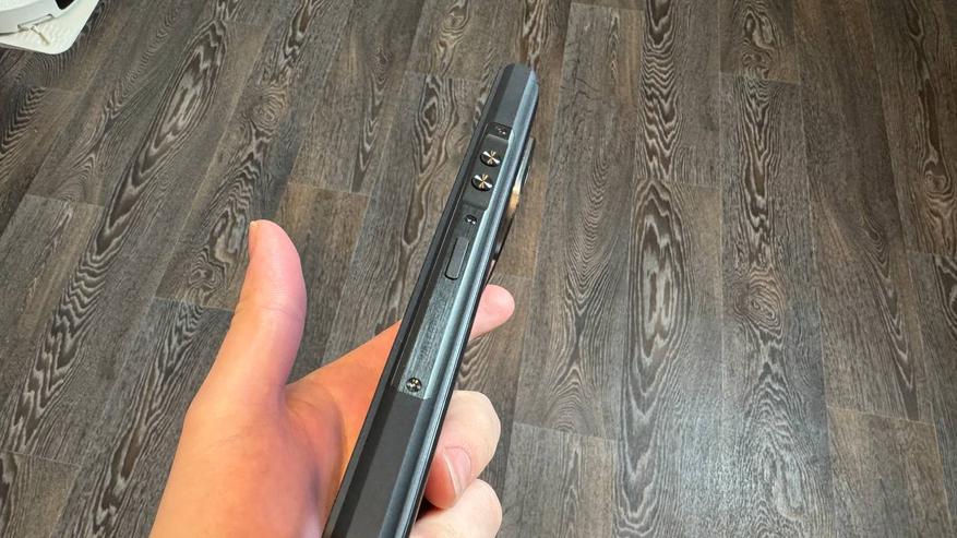 На левой грани отдельная программируемая кнопка действия и слот для SIM + карты памяти. Причём заявлена поддержка до 2 ТБ microSD, что превращает смартфон в подобие защищённого внешнего диска. На правой грани кнопка включения, совмещённая с достаточно шустрым сканером отпечатка. Рядом отдельно расположены две круглые кнопки регулировки громкости. громкости.