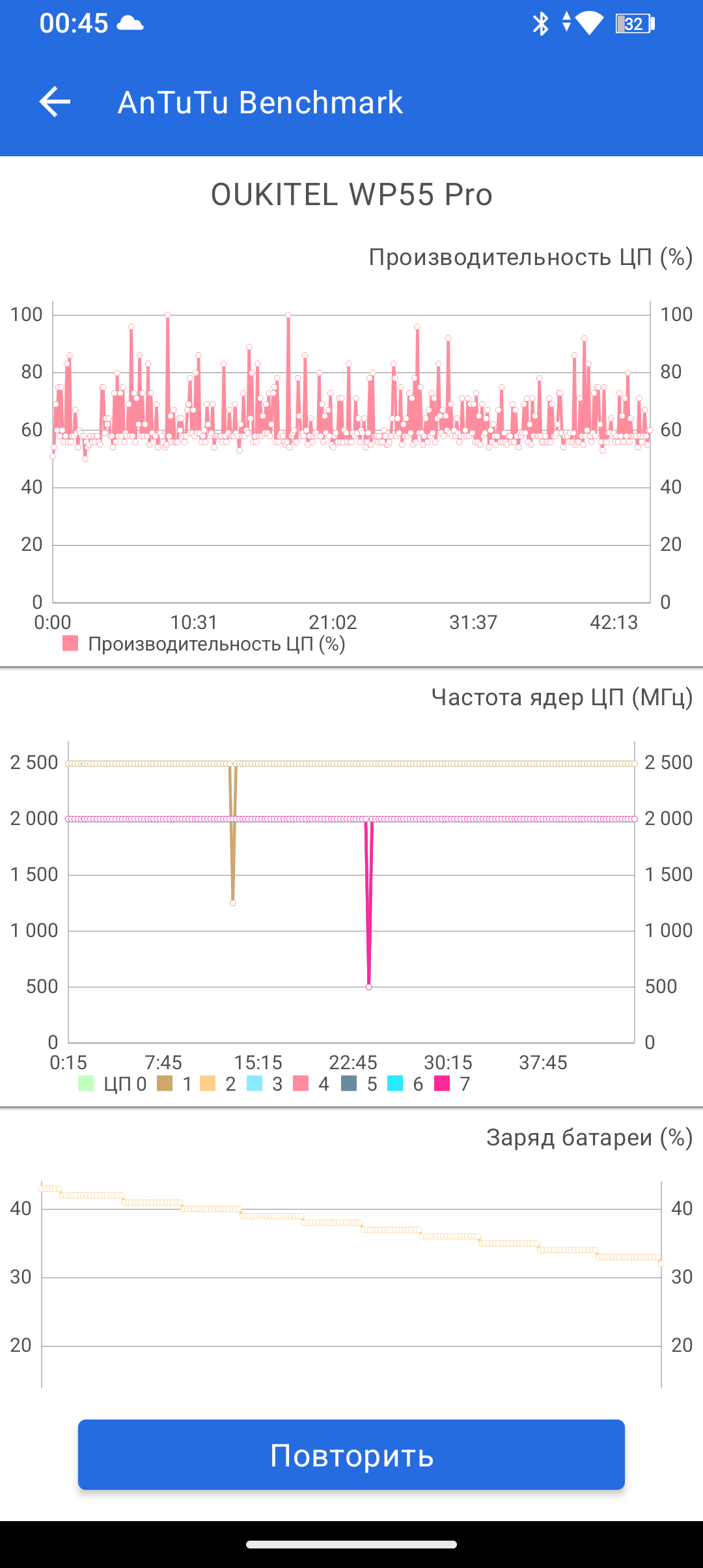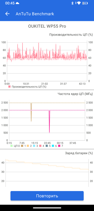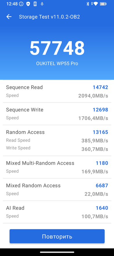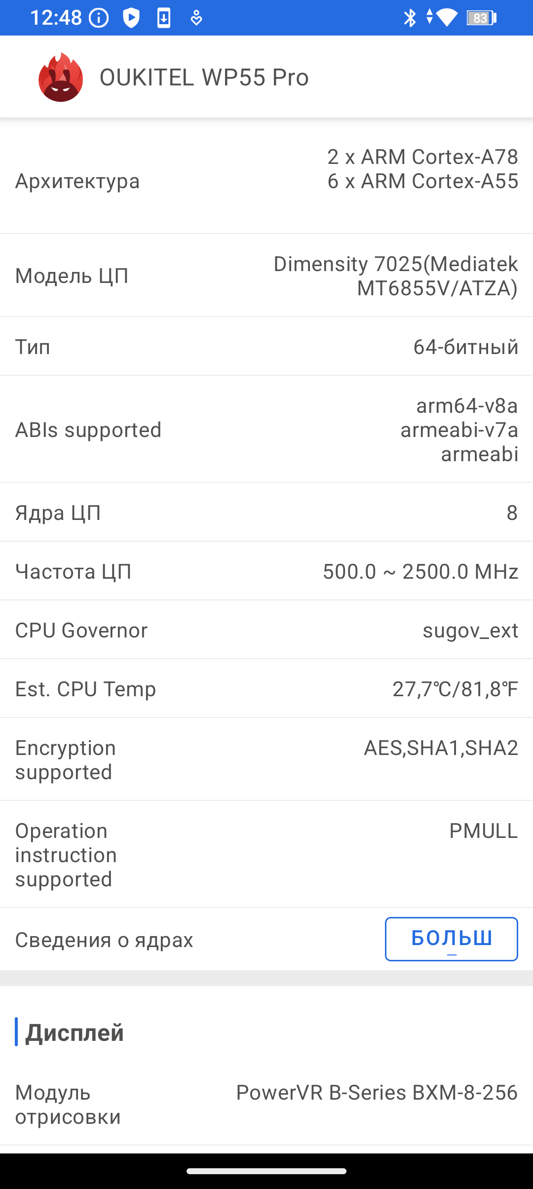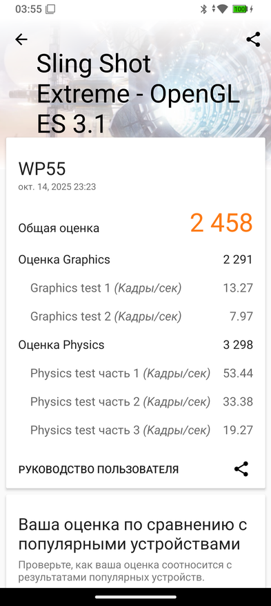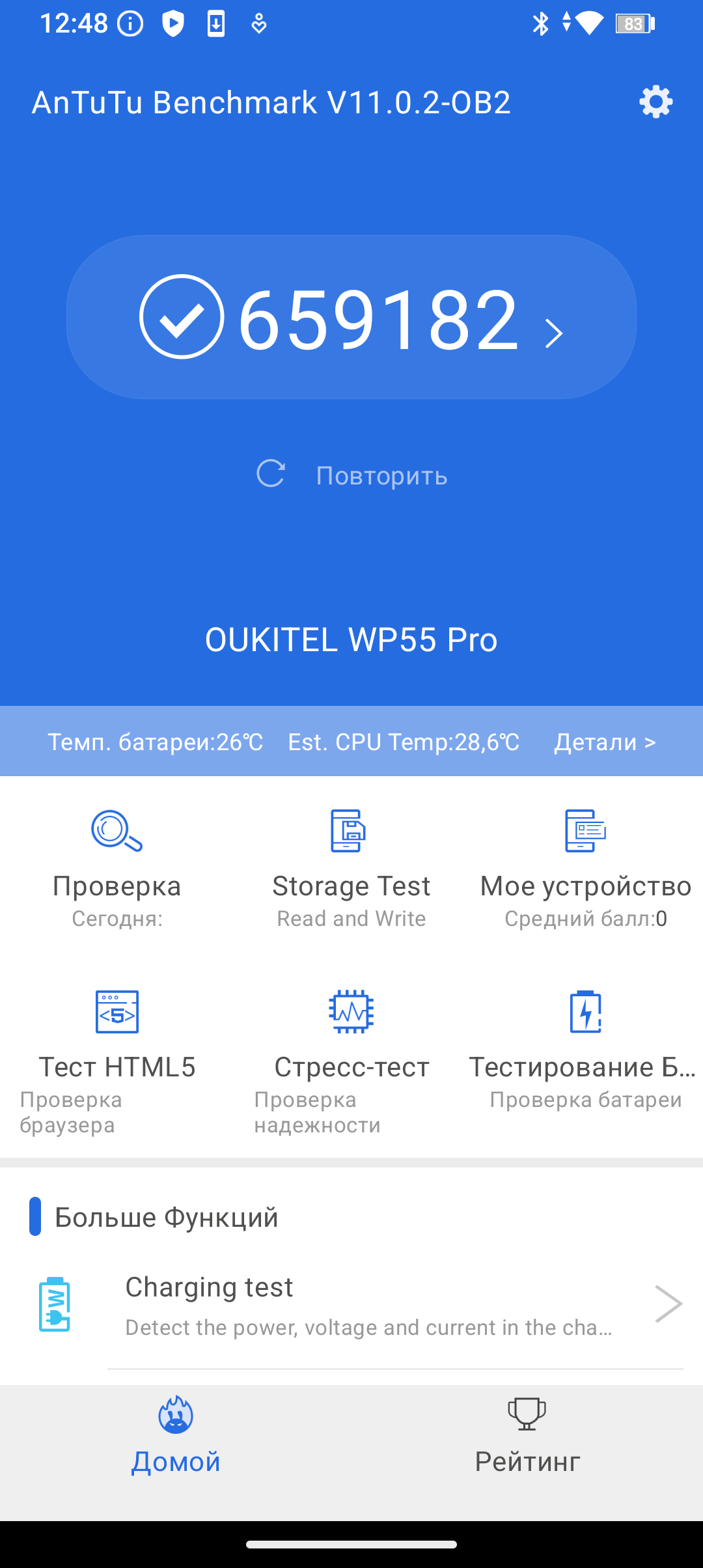 Процессор тот же, что и в WP55 Ultra (Dimensity 7025), поэтому и результат в бенчмарках похож. В Antutu (11 версия) смартфон выдаёт около 650 000 очков, что эквивалентно 490-500 тысячам в 10 версии. Для повседневных задачах производительности должно хватать с запасом.