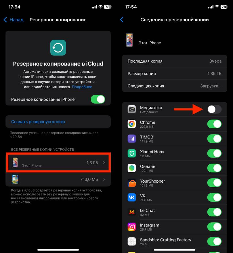 Откройте Настройки. Коснитесь своего имени и зайдите в iCloud. Нажмите Управление хранилищем, затем Резервные копии и выберите этот iPhone. Подождите, пока загрузится список данных, и выключите лишнее. Больше всего обычно занимают Фото.