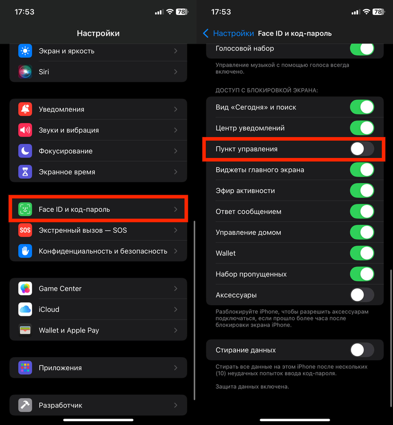 Откройте Настройки. Перейдите в Facе ID и пароль. Введите пароль. Найдите раздел Доступ с блокировкой экрана и выключите пункт Пункт управления.