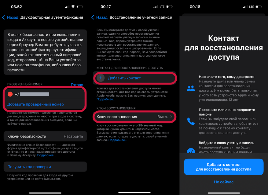 - Добавить контакт для восстановления доступа;