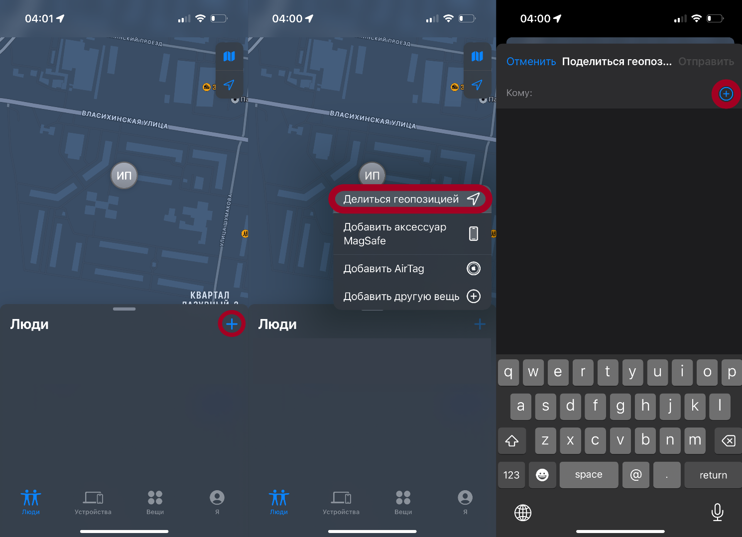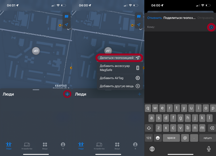Если у вас есть друг, знакомый или родственник с iPhone, то вы можете заранее поделиться с ним своей геопозицией (приложение «Локатор» — Люди — «Значок плюса» — Выбираем из списка контактов).