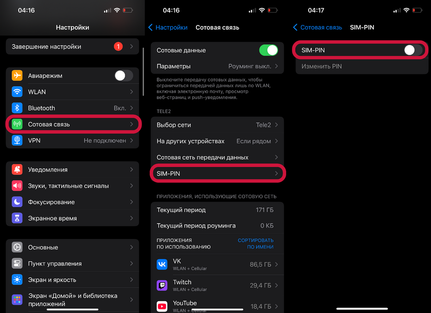 Используя вашу SIM-карту, злоумышленники могут получать SMS для восстановления доступа к различным аккаунтам, к которым привязан ваш номер. Чтобы это предотвратить, нужно установить SIM-PIN: Настройки — Сотовая связь — SIM-PIN.