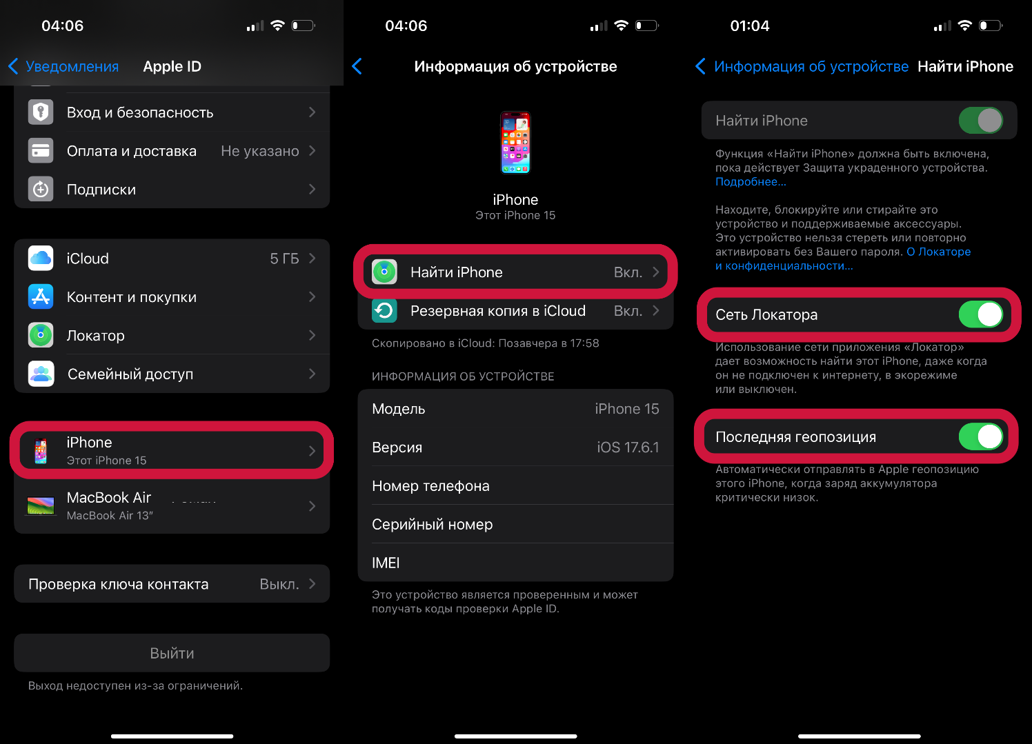 Далее важно убедиться, что iPhone подлючён к сети Локатора: Настройки — Apple ID — Выбираем свой iPhone — Найти iPhone. Сеть Локатора: Вкл. Последняя геопозиция: Вкл.