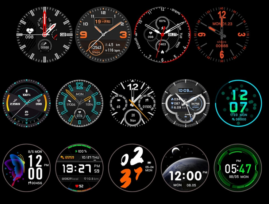 Всего предустановленных циферблатов в часах 14 штук, еще несколько циферблатов можно установить из приложения.