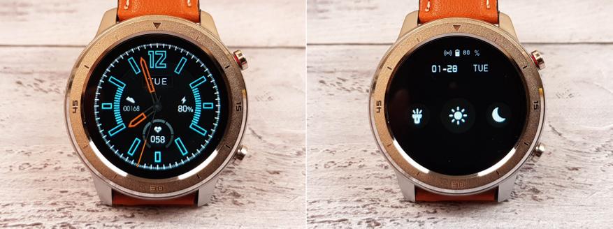 Ознакомимся с основными возможностями и настройками часов. Главный экран с циферблатом можно вызвать 3 способами: жестом поднятием руки (экран загорается на пару секунд), дабл тапом по экрану или нажатием любой физической кнопки. Мне больше всего удобно двойным касанием по экрану, хотя жесты тоже включены. Свайп вниз с главного экрана позволяет перейти в раздел с быстрыми настройками, где можно выставить яркость подсветки экрана и включить режим «не беспокоить», в котором при входящем уведомлении часы не будут вибрировать и включать подсветку экрана.
