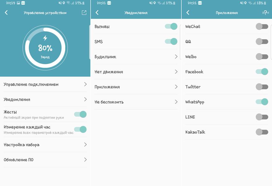 Покажу также важные настройки: жесты, автоматическое измерение, обновление ПО. И конечно уведомления, где кроется важная особенность. Часы не могут слать уведомления из любых приложений. Уведомления работают со строгим списком приложений, из знакомого это Facebook* и WhatsApp, а также звонки и смс.