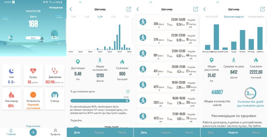 Познакомимся с приложением. Здесь все дублируется, но с более подробными данными и детальными настройками. Приложение называется Wear Fit 2.0. На главном экране показаны текущие показатели и последние измерения. Как обычно можно посмотреть статистику более детально за день, неделю или месяц. Шаги считает нормально, сравнивал с mi band 3, но часто реагирует на взмахи руками. В любом случае для меня шагомер это метод отслеживания активности, а не точный подсчет шагов. Выставил себе значение в 10 000 шагов и стараюсь его ежедневно придерживаться, сидячая работа обязывает.