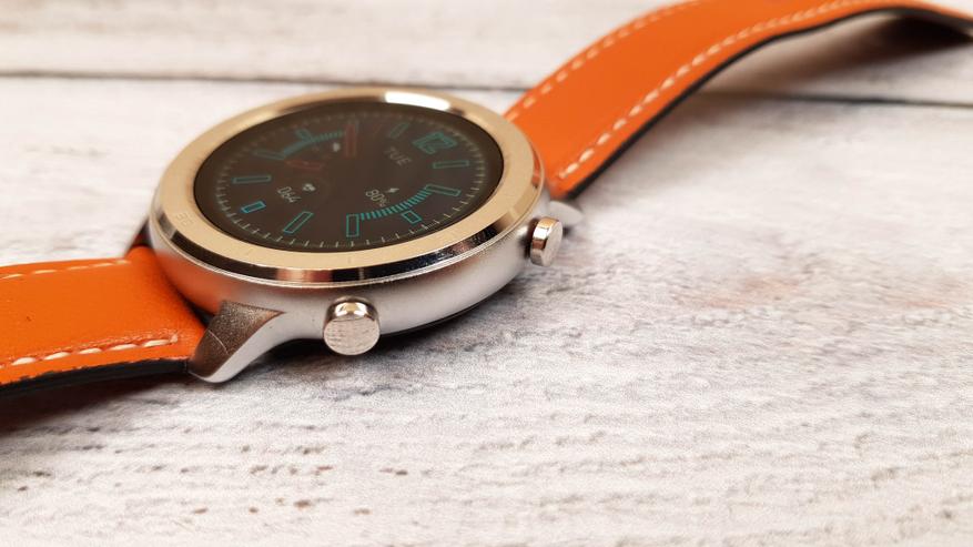 Управление организованно при помощи сенсорного экрана, в помощь к которому с левой стороны разместили 2 физических кнопки. Однократное нажатие любой из них означает действие назад (в меню) или включение\отключение экрана на циферблате. Верхняя кнопка дополнительно отвечает за полное выключение устройства и перезагрузку (длительное нажатие для вызова меню).