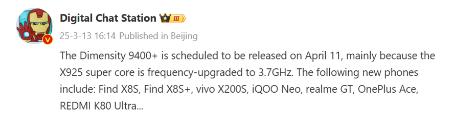 Также инсайдером Digital Chat Station был раскрыт список флагманских смартфонов, которые получат новый процессор первыми и выйдут в ближайшее время: Oppo Find X8S и X8+, VIVO X200S, iQOO Neo 10S Pro, Realme Neo 7 Pro, OnePlus Ace 5S, а также Redmi K80 Ultra. Смартфоны Oppo и VIVO будут представлены уже в апреле (пока только в Китае), остальные презентуют в мае — июне. Также ожидается, что в течении пары месяцев на глобальный рынок выпустят смартфон Xiaomi 15T Pro, который также скорее всего получит Dimensity 9400+ (у прошлого Xiaomi 14T Pro был Dimensity 9300+).