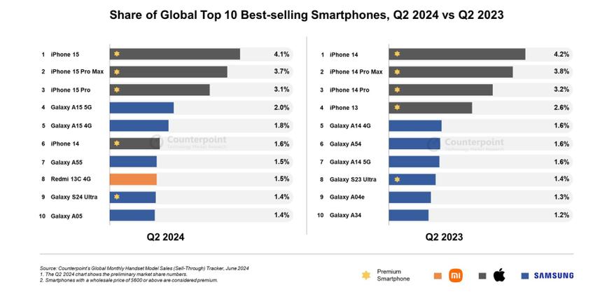 Четвёртое и пятое места занимают бюджетные модели Samsung — Galaxy A15 5G и Galaxy A15 4G, за ними следуют iPhone 14 и Galaxy A55. Единственной моделью, не относящейся к Apple и Samsung, оказался бюджетный Redmi 13C 4G, на его долю пришлось 1,5 % рынка. При этом он немного обогнал флагман Galaxy S24 Ultra, а дешёвый Galaxy A05 занял десятую строчку рейтинга.