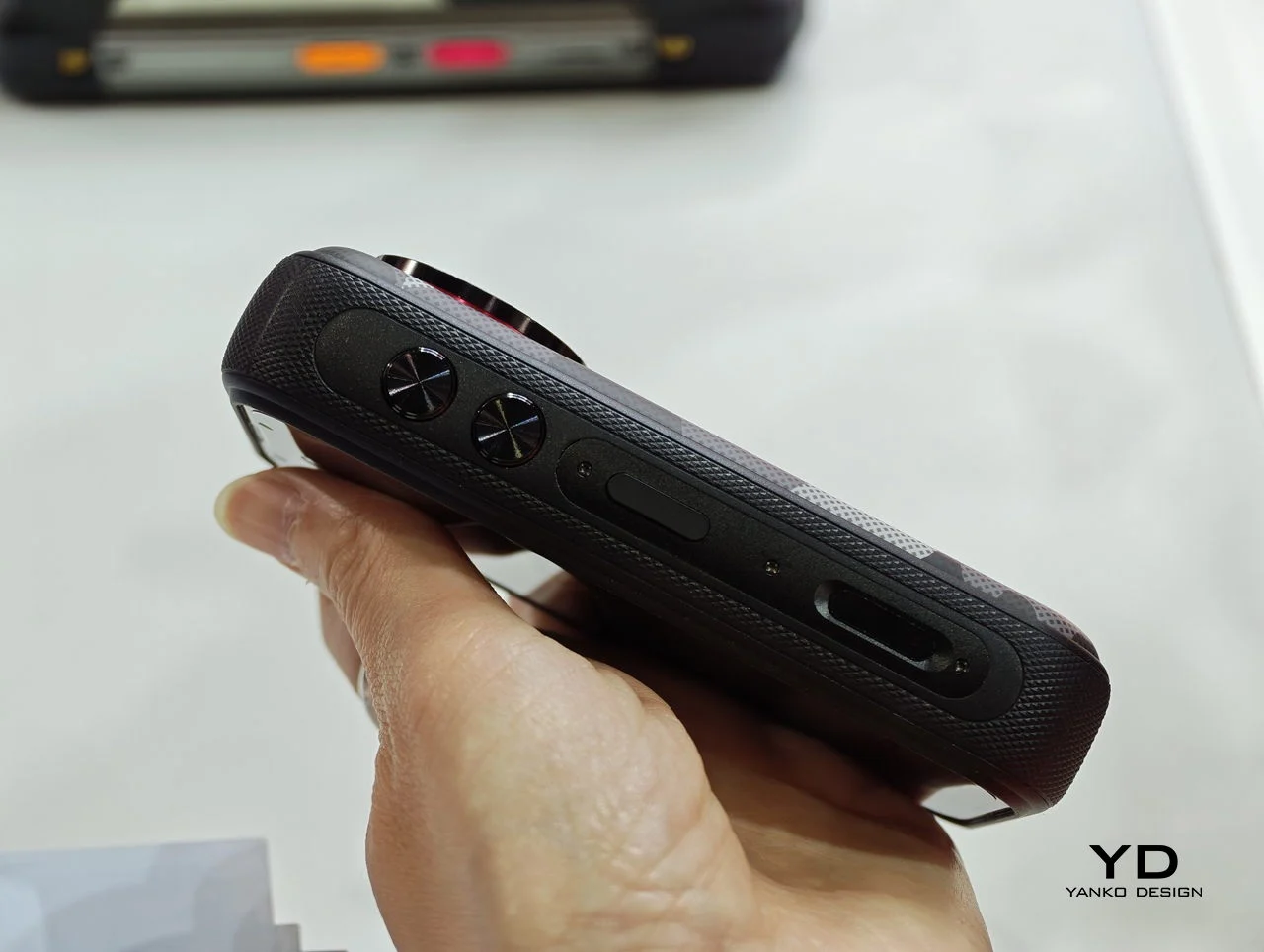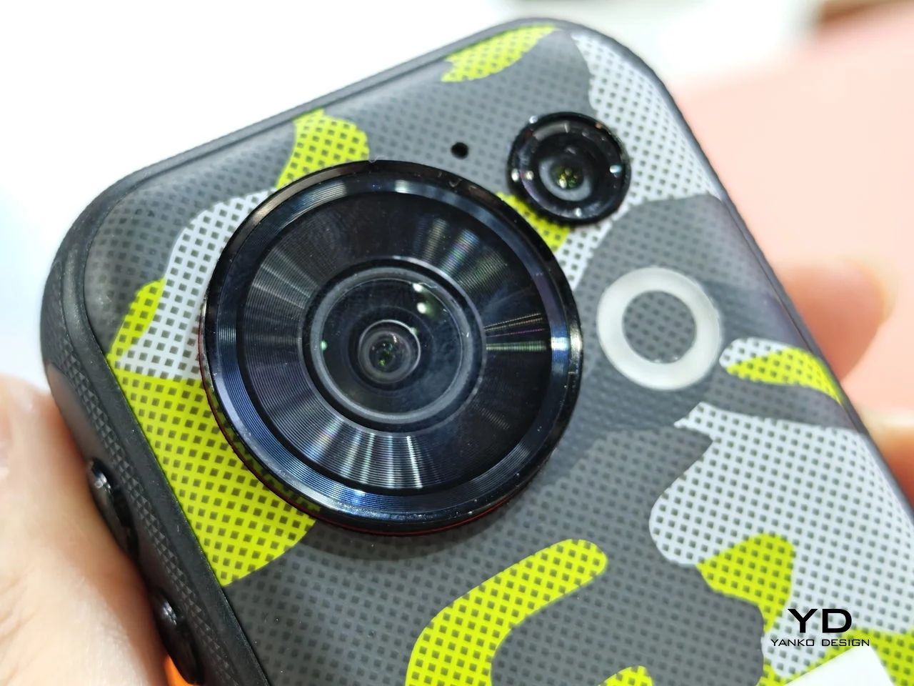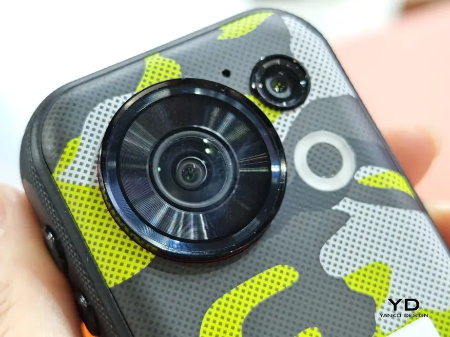 Смартфон оснащён 4,05-дюймовым дисплеем с частотой обновления 120 Гц. Основная камера имеет разрешение 48 мегапикселей и угол обзора 152,6 градуса. Для сравнения: сверхширокоугольные объективы большинства смартфонов имеют угол обзора от 70 до 90 градусов. Камера оснащена системой стабилизации изображения. На корпусе расположена физическая кнопка для мгновенного запуска съёмки без разблокировки устройства.
