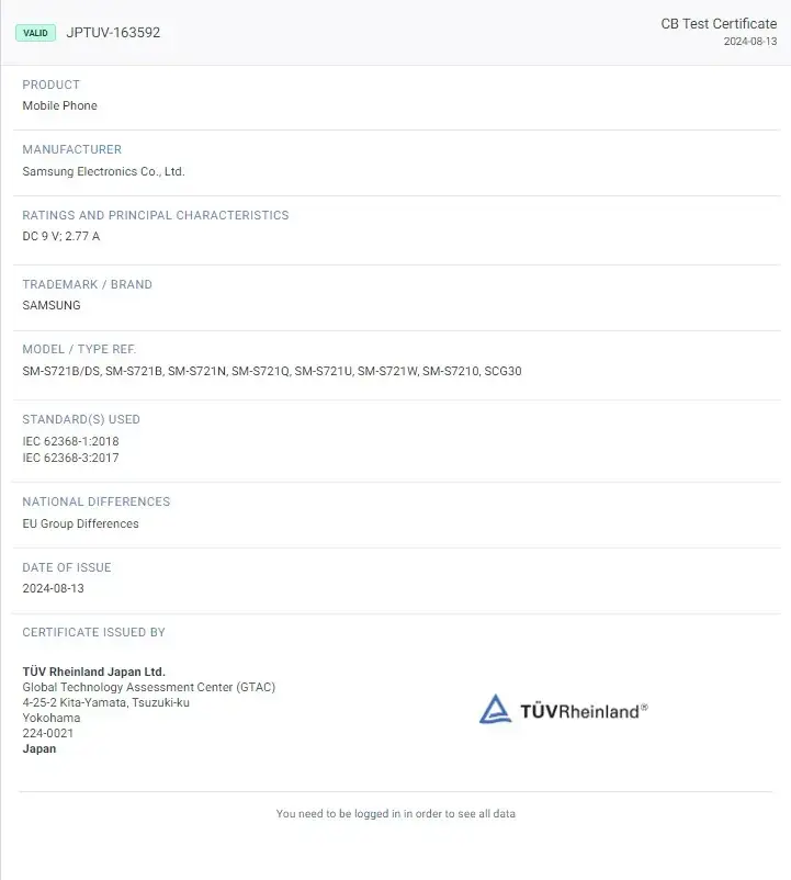 Tech Outlook обнаружил листинг Galaxy S24 FE в базе данных TUV Rheinland. Скриншот, представленный ниже, показывает, что смартфон может заряжаться при мощности ~25 Вт (9 вольт при 2,77 ампер).