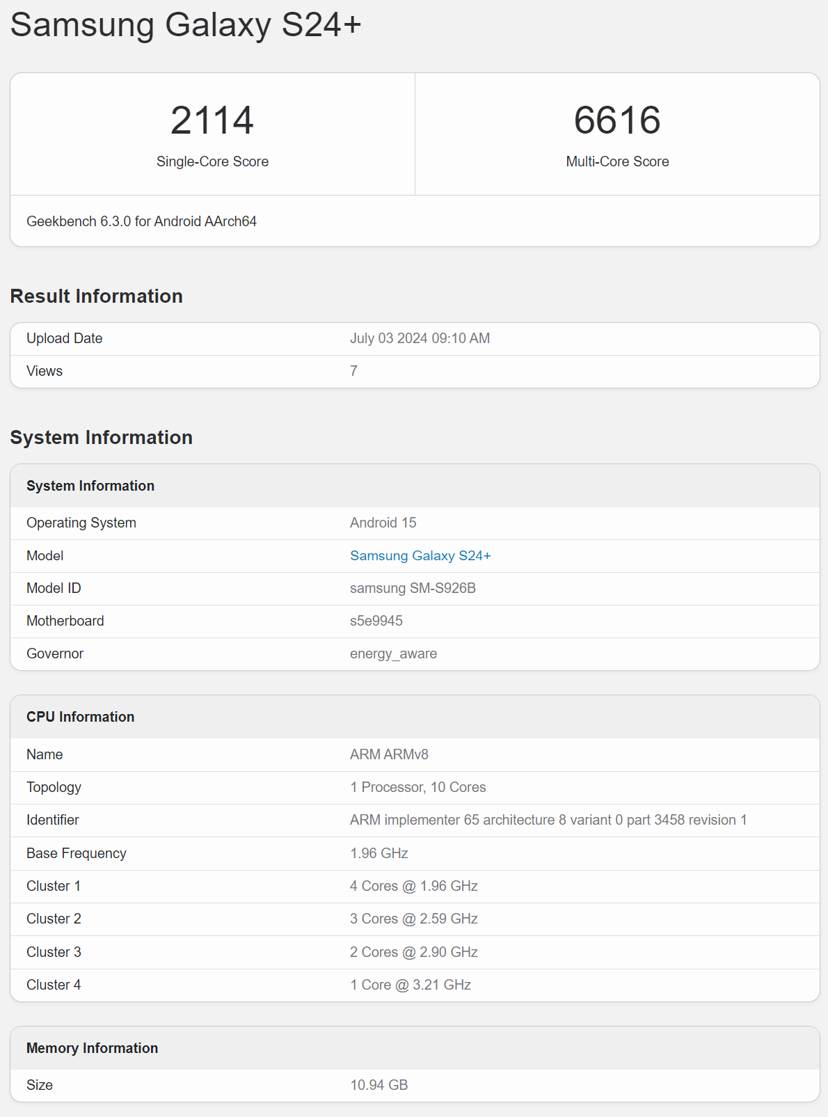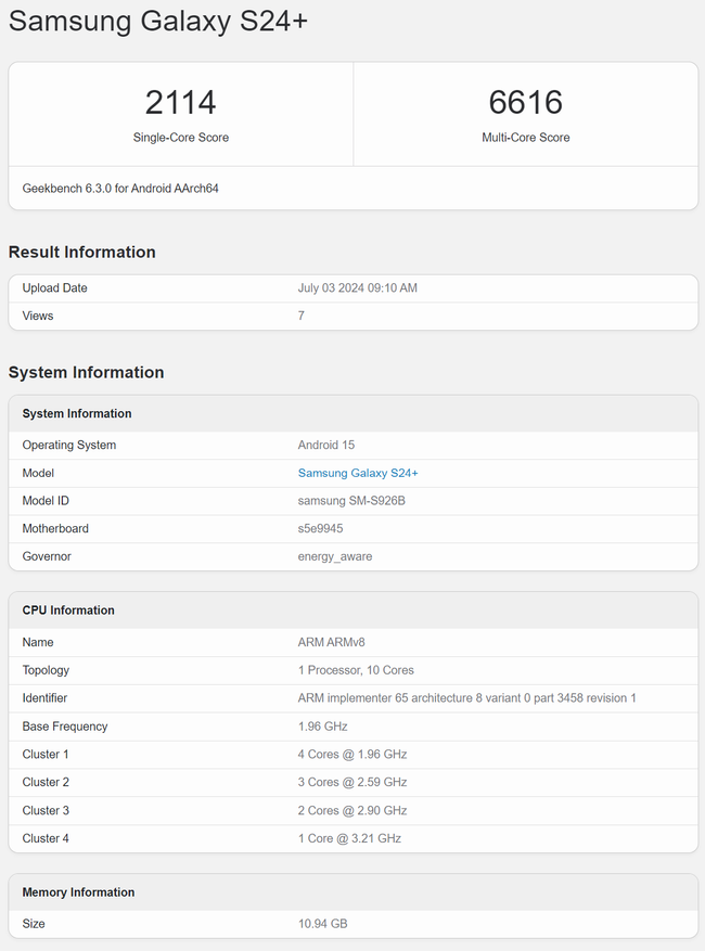 Инсайдер с ником @tarunvats поделился в своем аккаунте X скриншотом, демонстрирующим производительность смартфона Galaxy S24+ после обновления до One UI 7 (Beta) на платформе Geekbench. Согласно просочившимся результатам, устройство набрало 2114 баллов в одноядерном и 6616 баллов в многоядерном тестах.