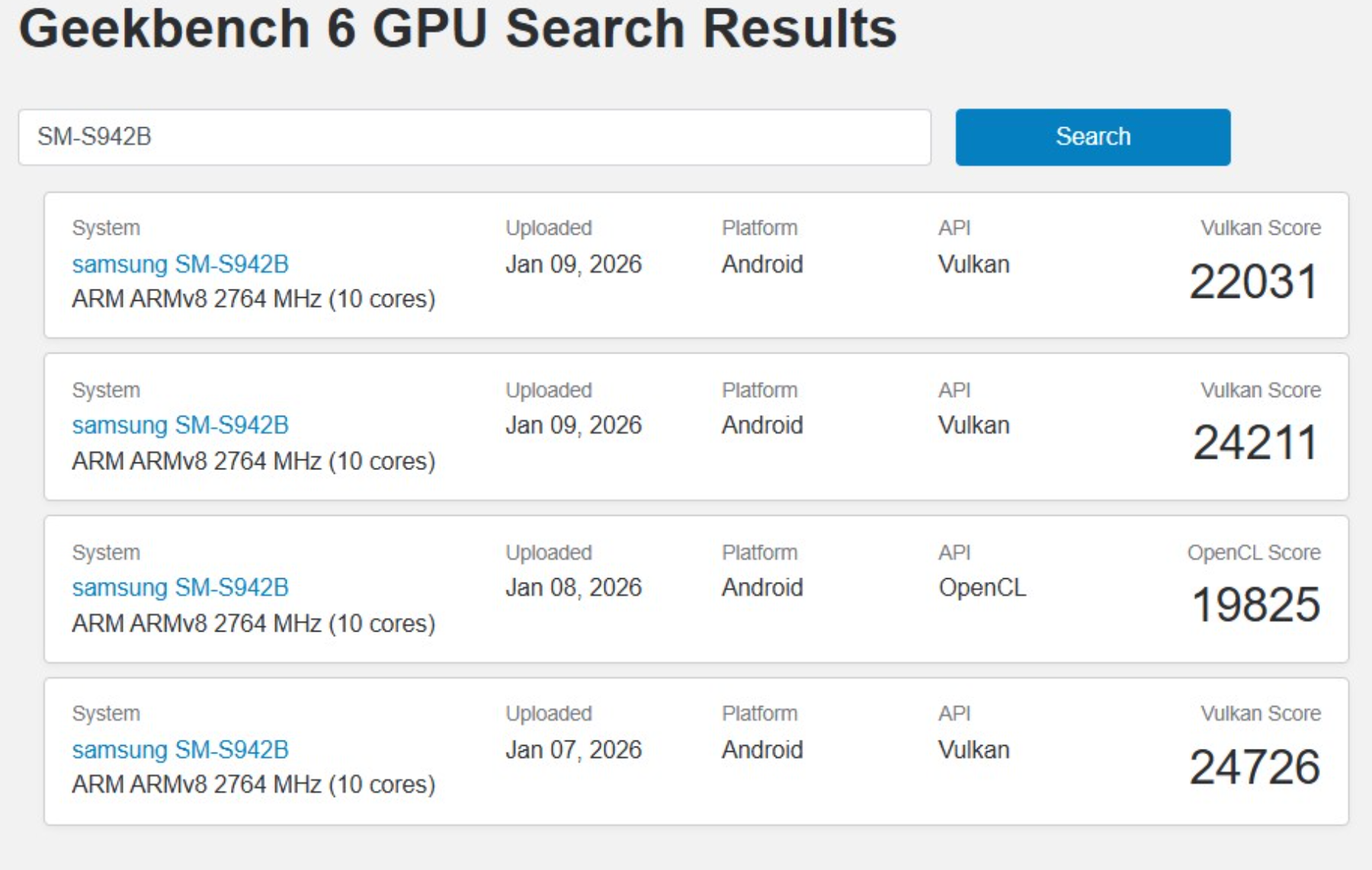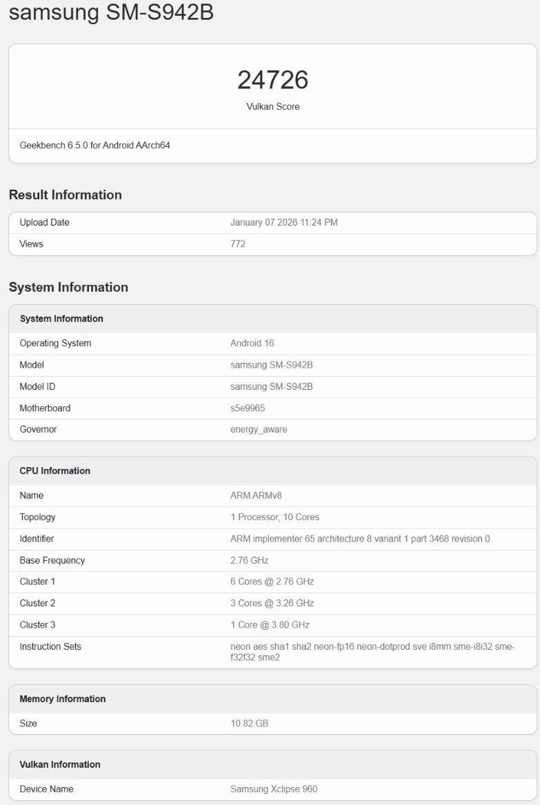 Недавно в Geekbench появилась запись о модели с индексом SM-S942B, которая, по прогнозам, станет международной версией Galaxy S26. Согласно опубликованным данным, устройство получило 10-ядерный SoC и графический ускоритель Xclipse 960, что указывает на использование Exynos 2600 и дает основания предполагать, что европейские версии смартфона могут получить чип, разработанный самой компанией Samsung.