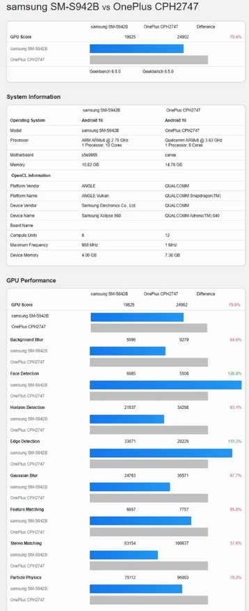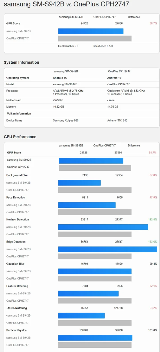 В текущих тестах внимание уделялось именно графическому ускорителю с использованием API Vulkan и OpenCL. В первых образцах Xclipse 960 показал результаты, близкие к Adreno 840. Сравнение не является полностью корректным, так как программные оптимизации, которые появятся позже, могут повлиять на показатели смартфона. На данный момент Xclipse 960 достигает примерно 88% производительности Adreno 840 в Vulkan и немного меньше 80% в OpenCL.