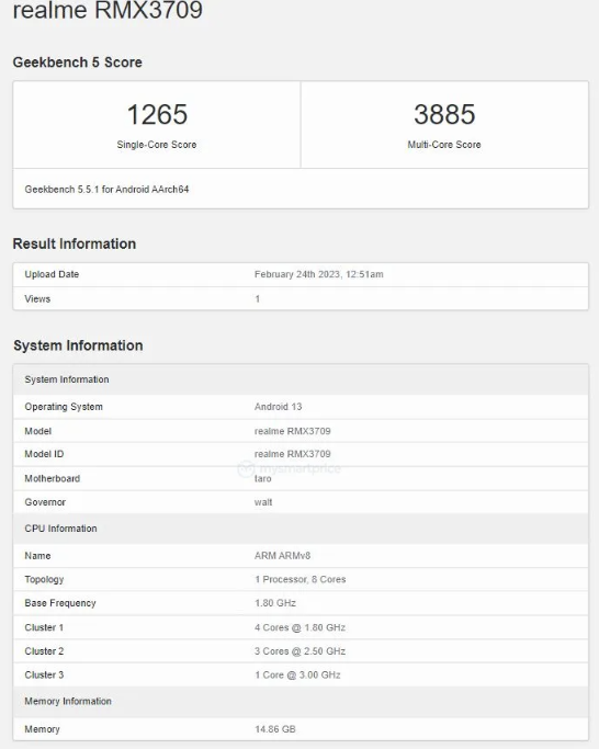Однако сегодня, в отчетах бенчмарка Geekbench, появились результаты тестирования смартфона Realme RMX3709. Энтузиасты сопоставили данные и обнаружили его также в базе данных NBTC в Таиланде под псевдонимом Realme GT 3 240W, что дало возможность узнать предстоящей новинке больше информации. Давайте посмотрим, что интересного расскажет нам Geekbench. Мы видим что процессорная часть включает 3 кластера: 4 экономичных ядра по 1,8 GHz, 3 крупных ядра по 2,5 GHz и одно супер ядро на 3 GHz. По этим показателям может быть, как Snapdragon 8 Gen 1, так и улучшенная версия Snapdragon 8 Plus Gen 1.