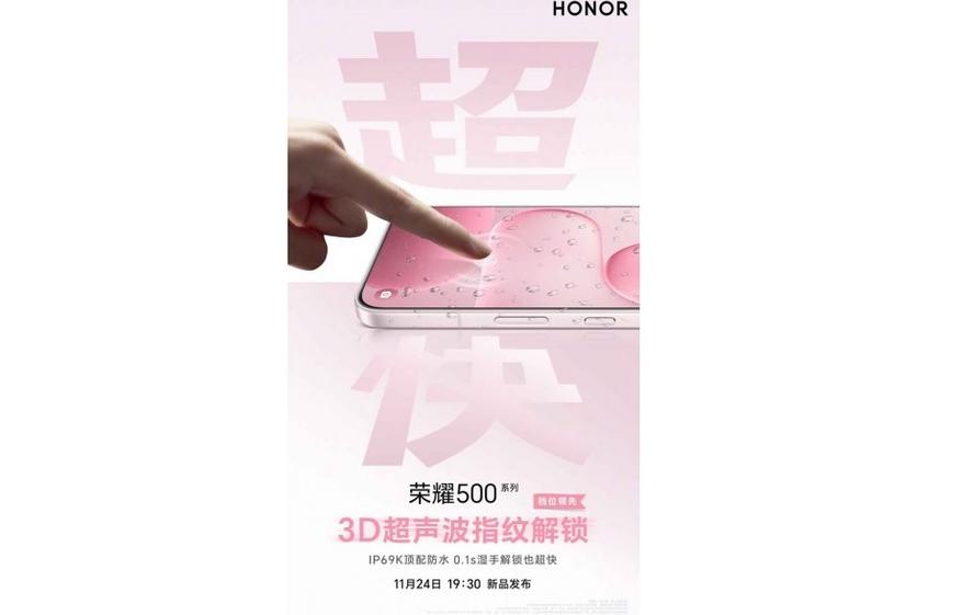 24 ноября в Китае состоится презентация Honor 500 и Honor 500 Pro от компании Honor. Дизайн обоих смартфонов уже был продемонстрирован производителем, а теперь стало известно, что Pro-версия смартфона получит встроенный в дисплей 3D-ультразвуковой сканер отпечатков пальцев.