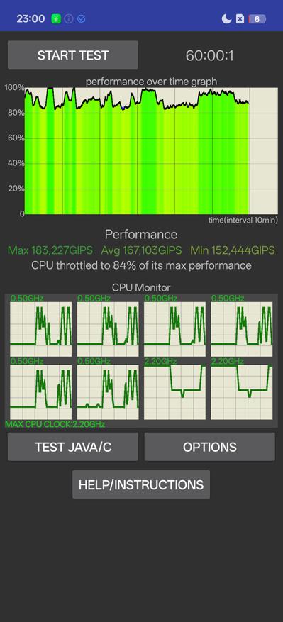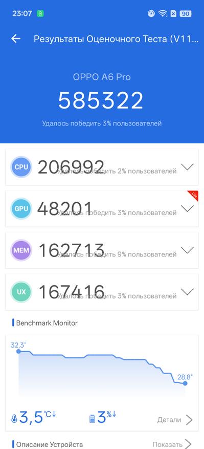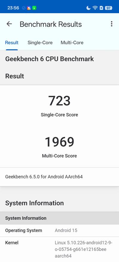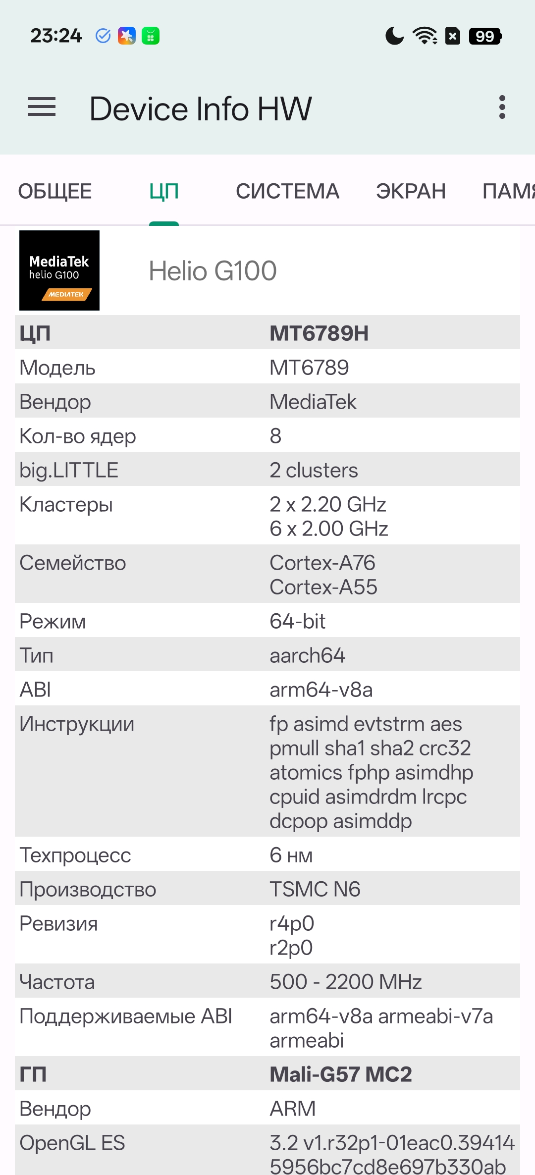 По своей структуре это типичный восьмиядерник, состоящий из пары производительных ядер Cortex-A76 с частотой 2,2 ГГц и шести энергосберегающих ядер Cortex-A55 с частотой 2 ГГц. В обычной эксплуатации (просмотр контента, работа с приложениями и какие-то онлайн-игры) мощностей предостаточно, какого-то троттлинга или задумчивости нет. В синтетике Helio G100 набирает 595К очков в AnTuTu 11 и 723/1969 очков в одноядерном и многоядерном тестах Geekbench 6.