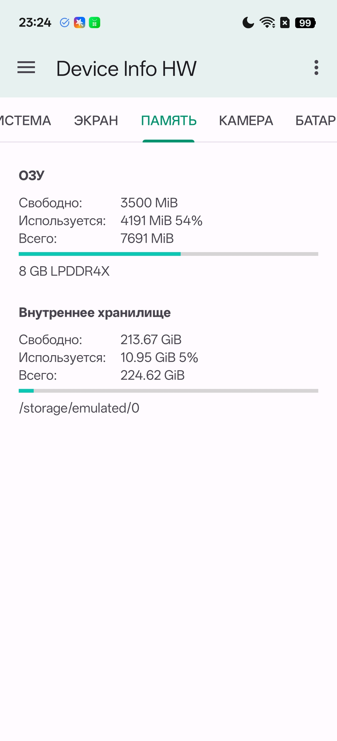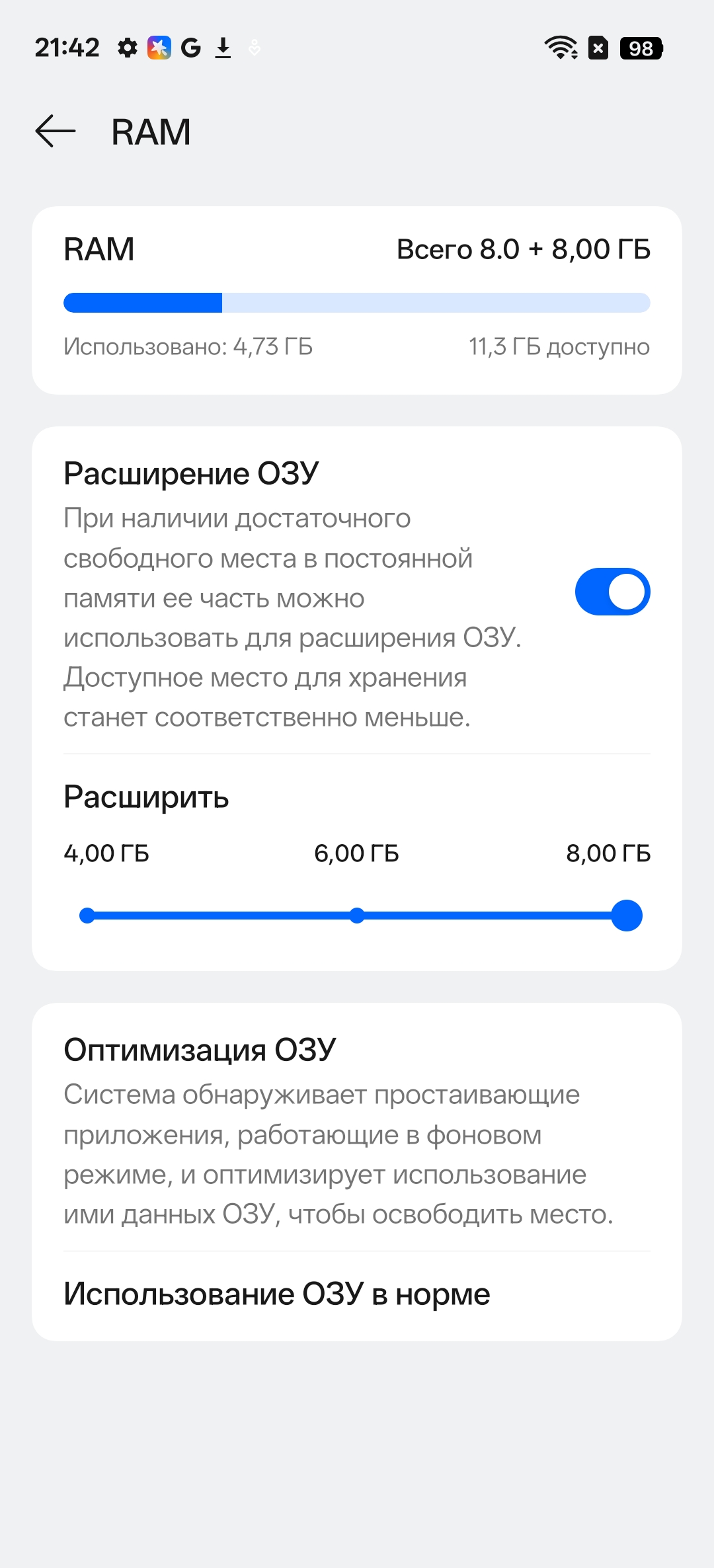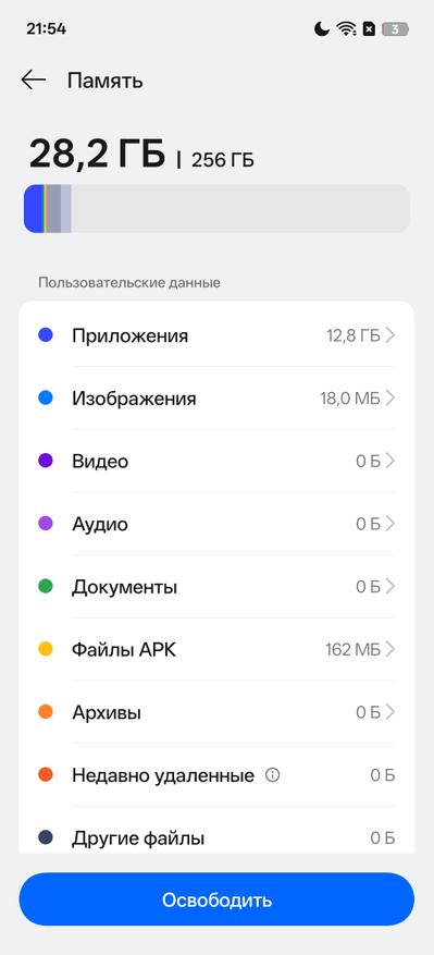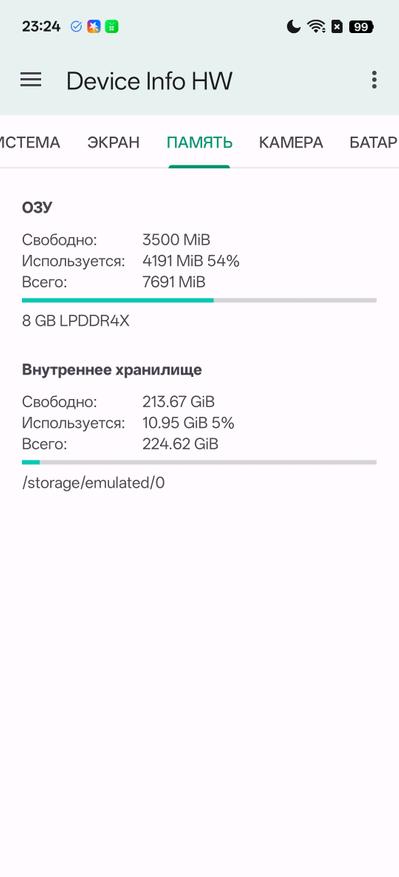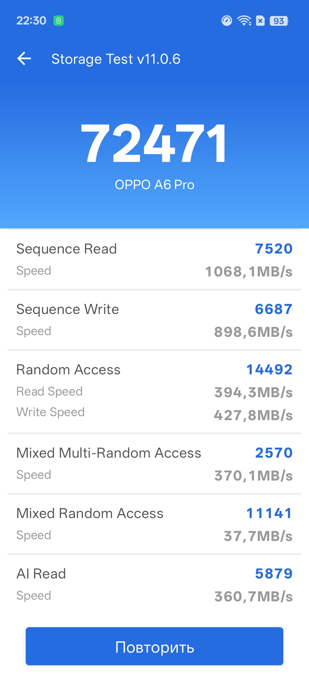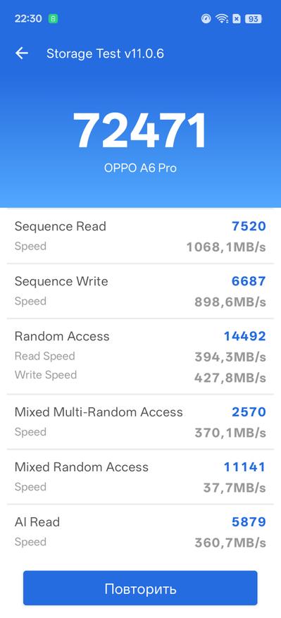 Набор памяти представлен в единственном варианте — 8 ГБ оперативной (LPDDR4X) и 256 ГБ постоянной (UFS 2.2). По сравнению со стандартом UFS 2.1, используемым в предыдущем OPPO A5 Pro, прирост скорости получился существенным: вместо 513,7 и 267,3 МБ/с мы получаем 1068 и 898,6 МБ/с. Разница видна практически везде: при копировании данных, установке приложений и работе с элементами системы. Если оперативной памяти будет недостаточно, то за счёт накопителя её можно расширить до 16 ГБ (8+8).