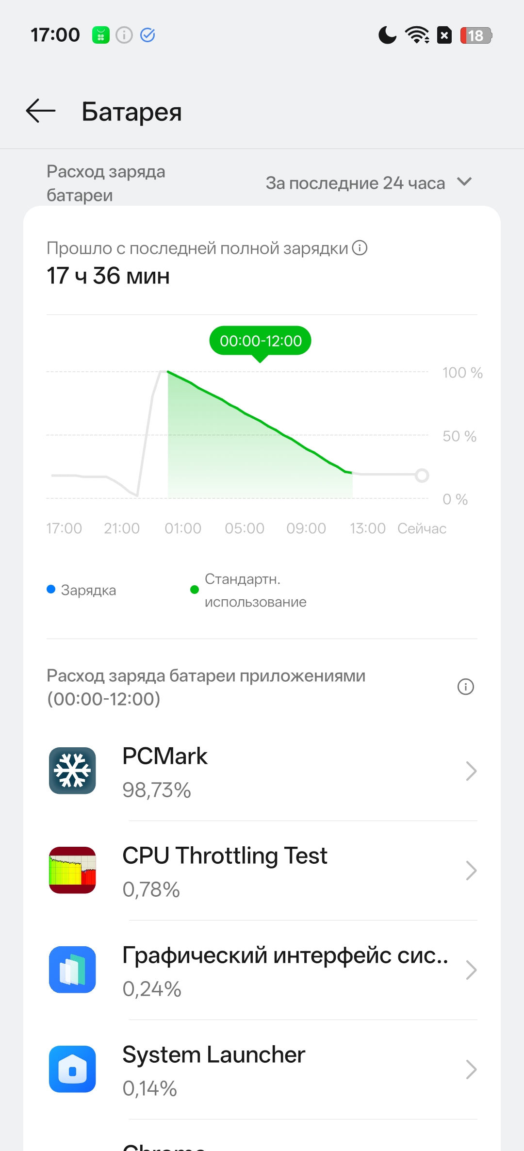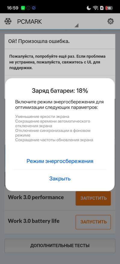 Если запустить стандартный тест в PCMark, выставить максимальную яркость, то итоговое время составит 12 часов 15 минут. И это с остатком в 20%, на которых телефон сможет продержаться ещё пару часов.