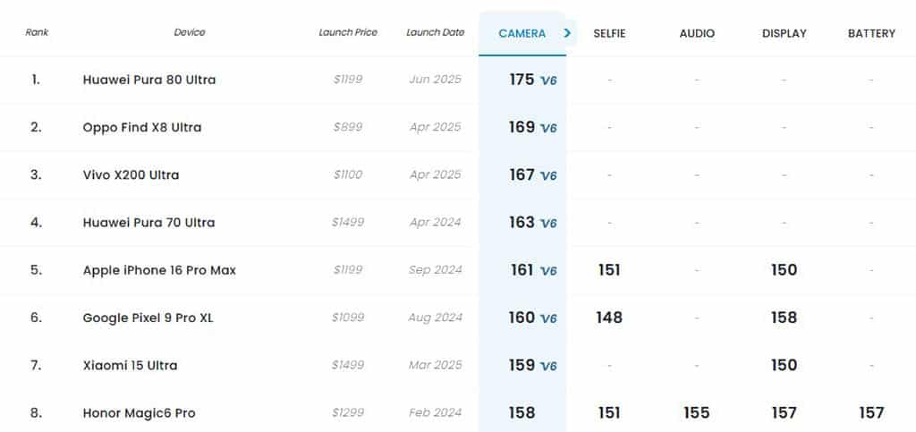 Huawei Pura 80 Ultra установила новый рекорд в рейтинге камер DxOMark