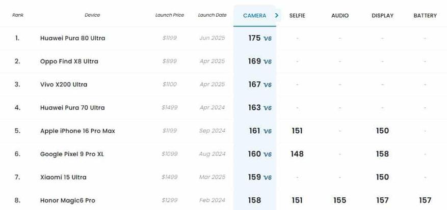 Компания DxOMark присвоила смартфону Huawei Pura 80 Ultra рекордные 175 баллов в своём глобальном рейтинге камер, что позволило устройству занять первое место, опередив ближайших конкурентов OPPO Find X8 Ultra и Vivo X200 Ultra. Новый флагман Huawei также установил рекорды в отдельных категориях: 180 баллов за фотосъемку и 166 баллов за видеосъемку.