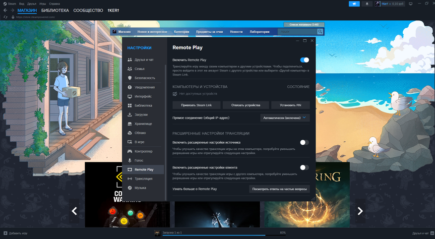 2. После входа в аккаунт открываем настройки клиента Steam и переходим в раздел Remote Play.