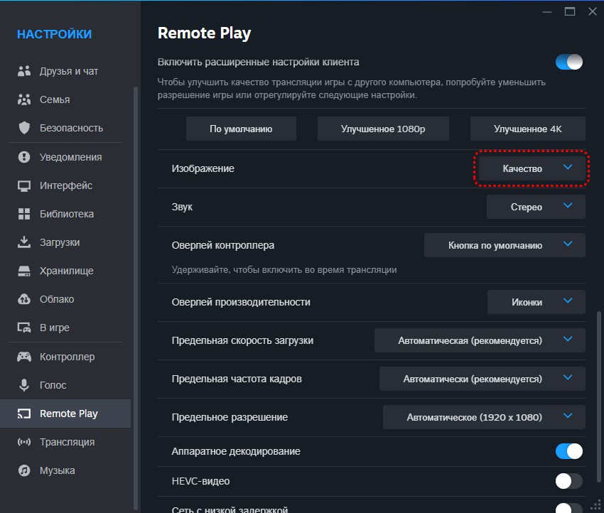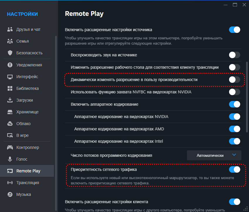 Активируем опции «Включить расширенные настройки источника» и «Включить расширенные настройки клиента». В появившихся вкладках отключаем динамическое изменение разрешения в пользу производительности, активируем приоритетность сетевого трафика и выставляем профиль изображения на «Качество». Все эти настройки необходимы для минимизации латентности ввода и максимального качества картинки.