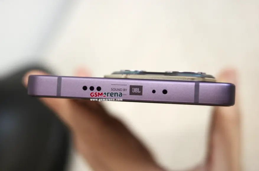 Устройство оснащено дисплеем с центральным вырезом под селфи-камеру, кнопкой питания на правой грани и клавишами настройки громкости на левой. На нижней панели размещен слот для SIM-карты, порт USB-C, основной микрофон и решетка динамика. Сверху устройства находятся дополнительный микрофон, ИК-порт и еще одна решетка динамика. Присутствие логотипа «Sound By JBL» подтверждает, что аудиосистема устройства настроена JBL.