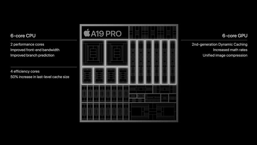 Корпус iPhone 17 Pro выполнен из алюминия и оснащен испарительной камерой для эффективного охлаждения процессора A19 Pro. Такой подход обеспечивает стабильную работу даже в самых требовательных приложениях и играх. Графический процессор получил шесть ядер вместо пяти, как у iPhone Air, что заметно повышает скорость обработки графики и позволяет запускать современные игры с максимальными настройками без просадок FPS.