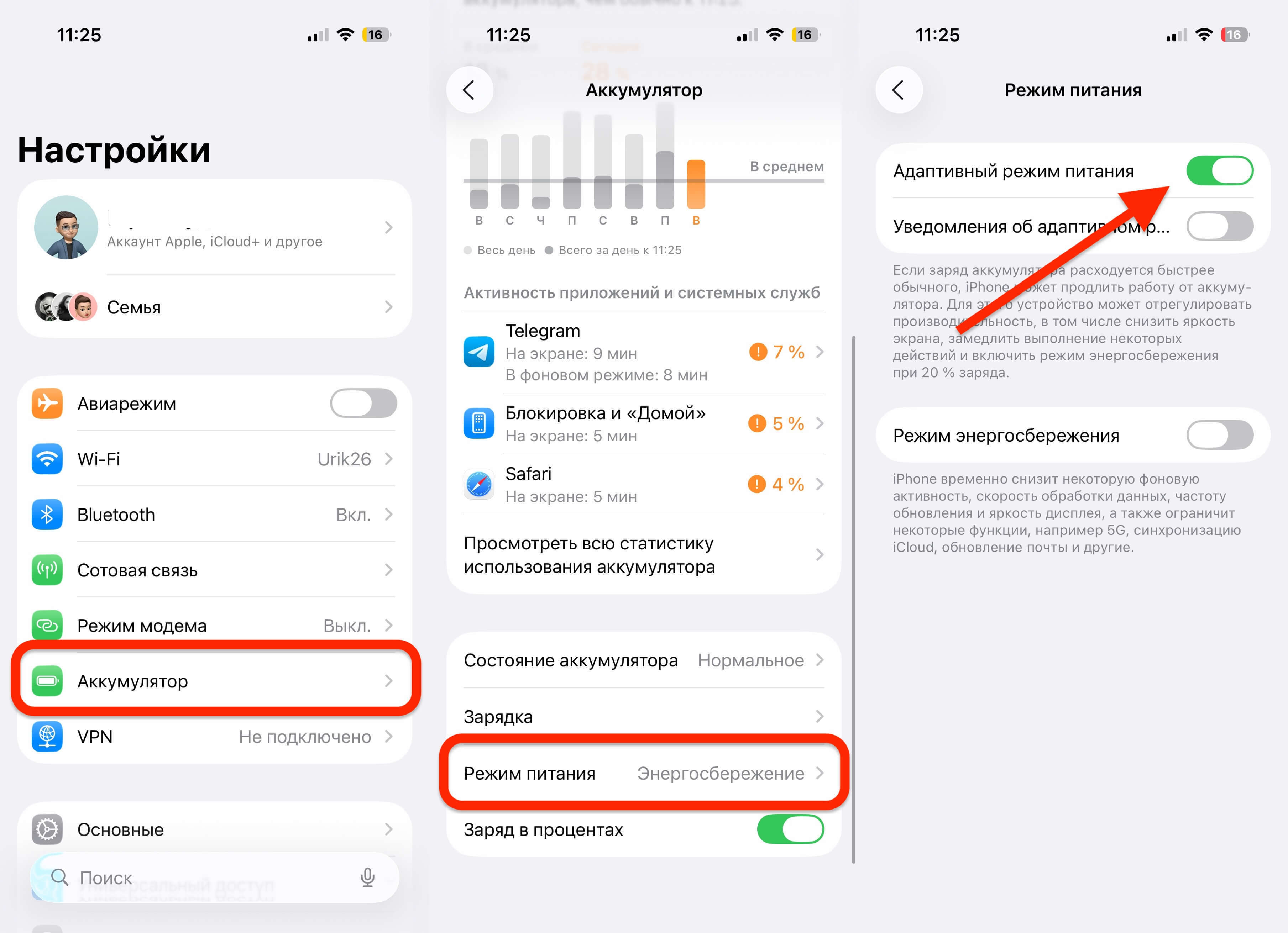 «Адаптивный режим питания» это «умная экономия», которая не заставляет вас вручную переключать профили. Один раз включили и iPhone сам подстраивается под ваш день, тихо даря лишние часы работы.