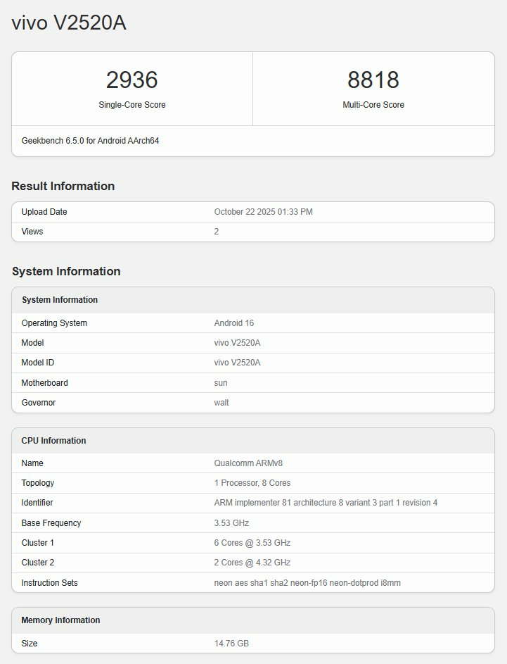 Компания iQOO готовится представить свой новый смартфон Neo 11, официальный релиз которого назначен на 30 октября и пройдёт в Китае. Незадолго до премьеры устройство засветилось в базе Geekbench, благодаря чему стали известны его ключевые аппаратные особенности — от процессора и объёма памяти до программной платформы. Судя по утечке, смартфон станет производительным, но при этом доступным решением, способным уверенно составит конкуренцию таким устройствам, как Redmi K90, Realme GT 8 и прочих.