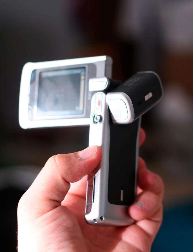 Но поворотной была не только камера. Верхняя створка раскладушки, будучи открытой под прямым углом относительно клавиатуры, тоже могла поворачиваться и фиксироваться под углом 90 градусов. В таком положении телефон превращался в некое конструктивное подобие видеокамеры Sony Handycam, и в таком случае в роли видоискателя выступал уже внутренний дисплей. Была даже кнопка начала записи на правом торце корпуса, которая оказывалась аккурат под большим пальцем правой руки пользователя. В режиме съёмки фото эта же клавиша отвечала за спуск затвора. В «обычной жизни» она работала как джойстик. Видео писалось в формате 3GP (MPEG-4), с разрешением до 352х288 пикселей и частотой 15 кадров в секунду. Сейчас, когда любой бюджетный смартфон может снимать FullHD-ролики, эти цифры вызывают лишь улыбку, а ведь в 2005 году это был один из лучших показателей на рынке.