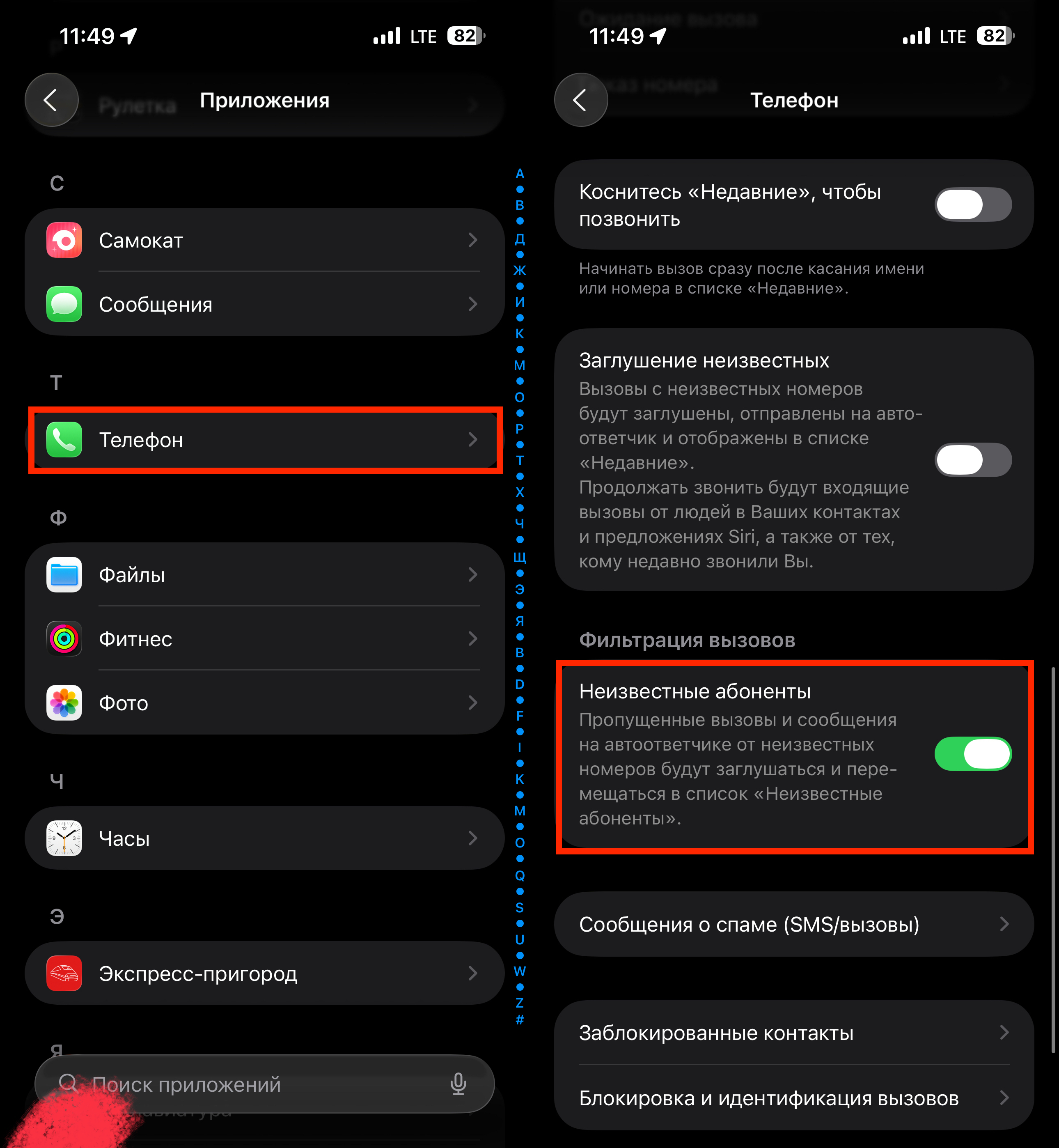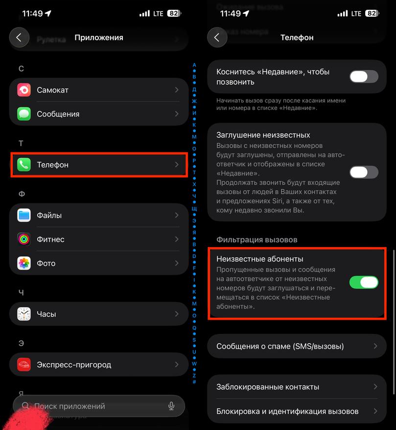 Чтобы включить фильтрацию, откройте Настройки → Приложения → Телефон и прокрутите вниз до раздела «Фильтрация вызовов». Здесь активируйте переключатель «Неизвестные абоненты».