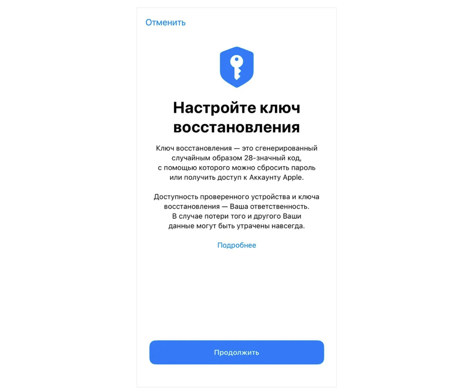 Ключ восстановления это длинный код, который Apple генерирует для вашего Apple ID. Он нужен для восстановления доступа, если остальные способы не сработали.