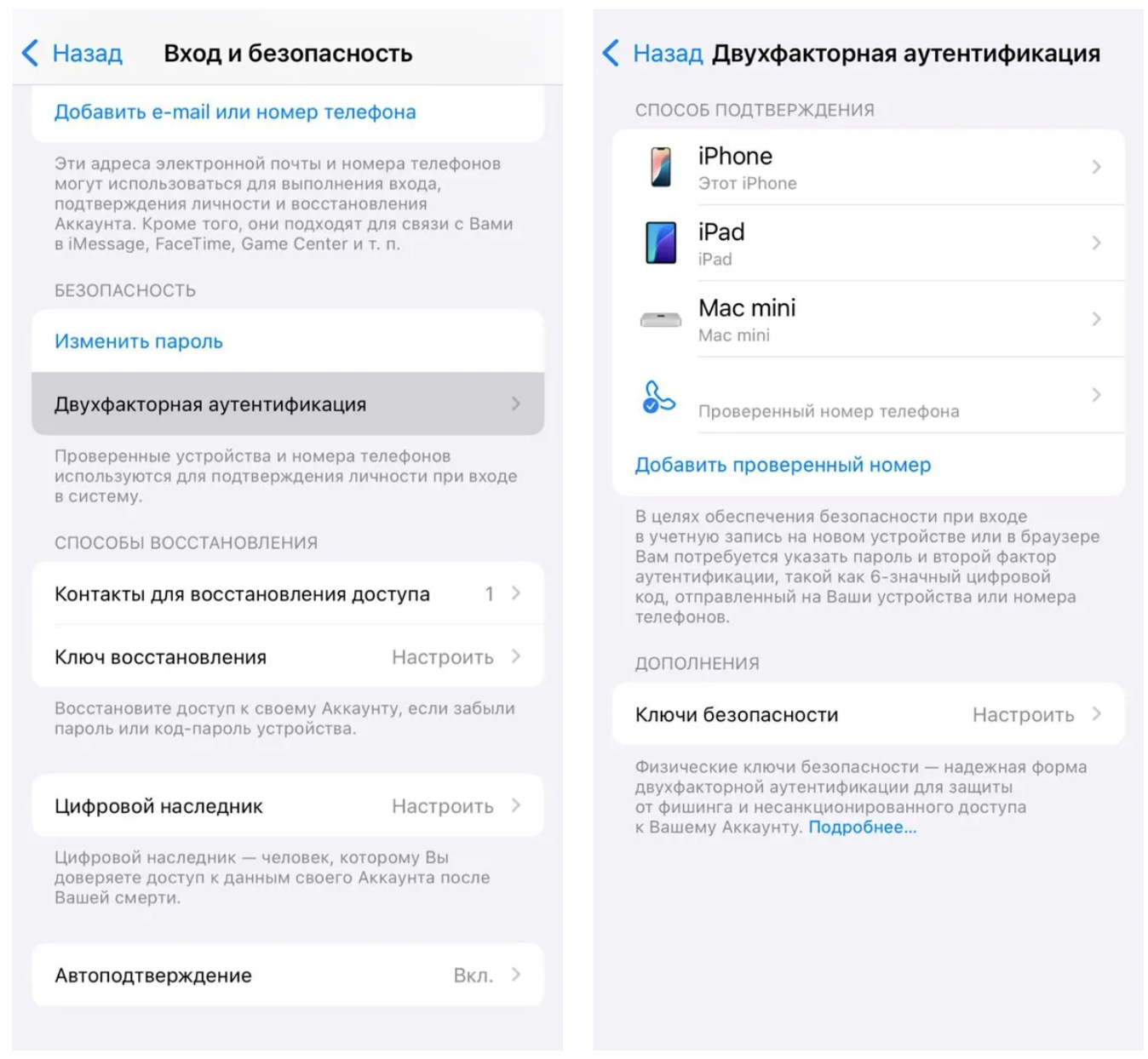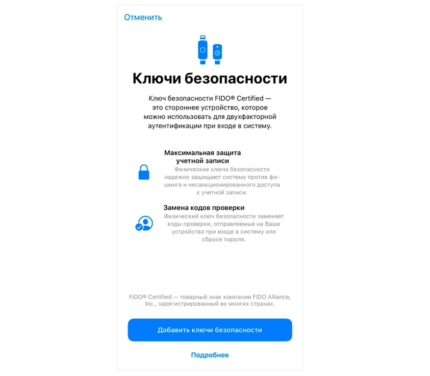 Если пункт «Ключи безопасности» не отображается, чаще всего дело в версии iOS. Обновитесь и проверьте снова.