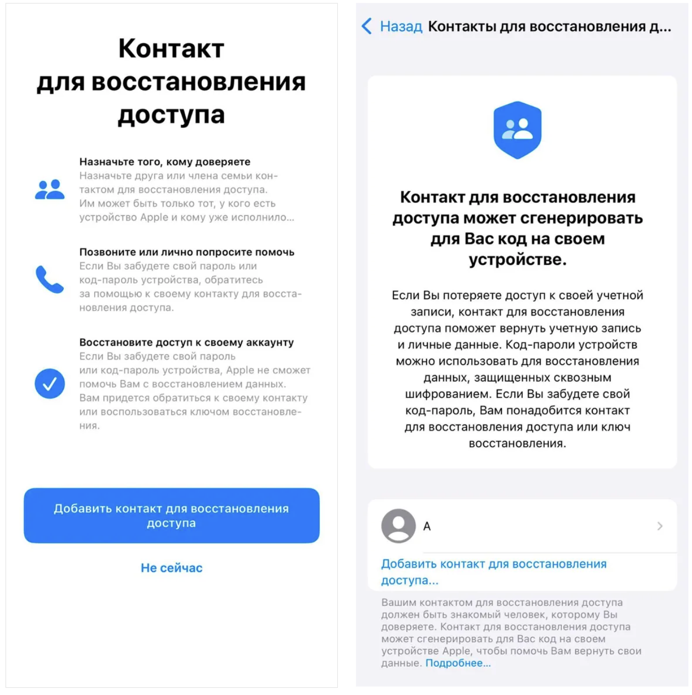 Этот способ сможет вернуть доступ, если вы забудете пароль или потеряете телефон. Суть в том, что вы заранее выбираете человека, который сможет выдать вам код восстановления. Он не получает доступ к вашему Apple ID и не видит ваши данные. Он просто помогает пройти проверку, когда вам это нужно.