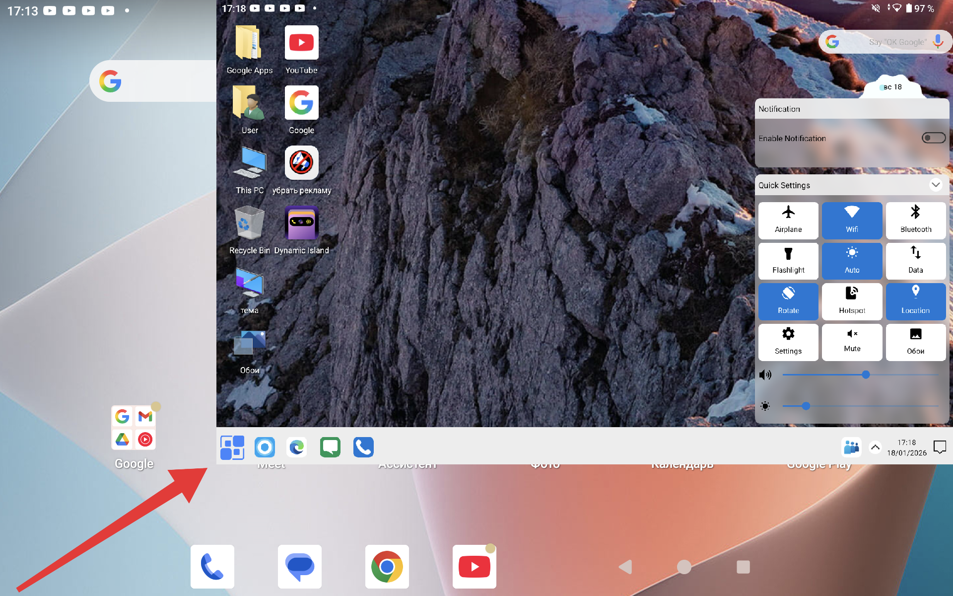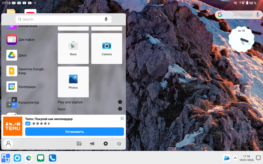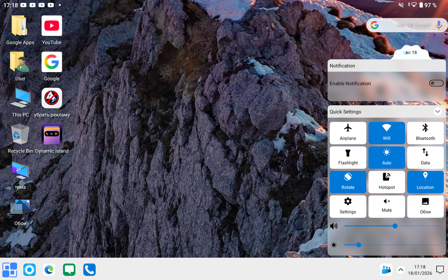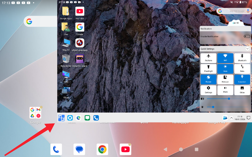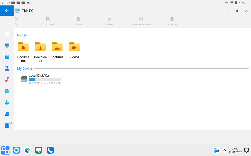 После выполнения этого краткого гайда вы получаете рабочий стол как на ОС Windows. Есть кнопка «Пуск», удобное управление папками через стандартный «Мой компьютер» и прочее визуальное и смысловое оформление, о котором вы и так все знаете. Однако, «Панель задач» не совсем реализована так же, как на ПК. Приложения сворачиваются как бы в отдельное подменю, также не работает стандартная «Корзина». Причём вы можете встретить надпись на файле «Переместить в корзину», но после нажатия на нее файл просто удалится с устройства. В общем, чтобы вы сразу понимали, не все будет работать так же, как в Windows.
