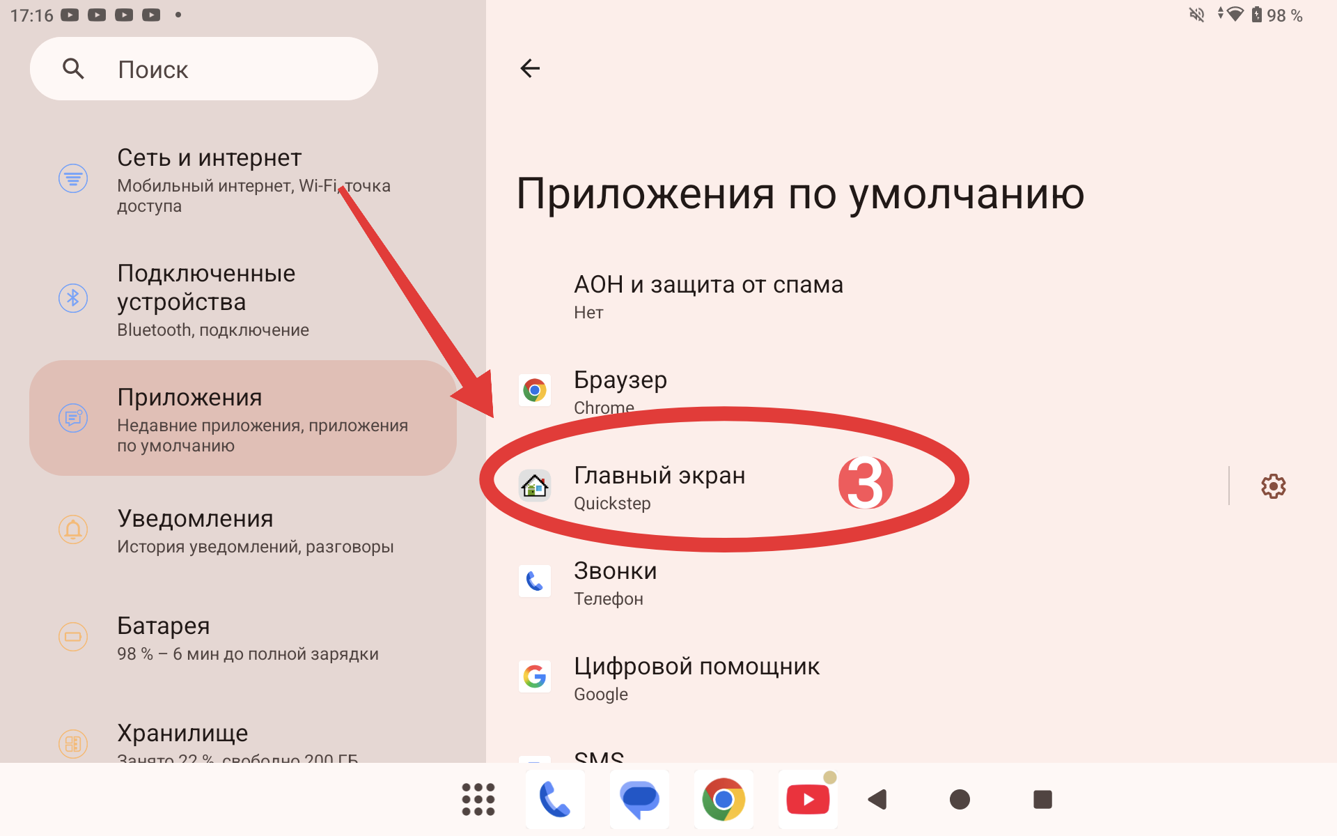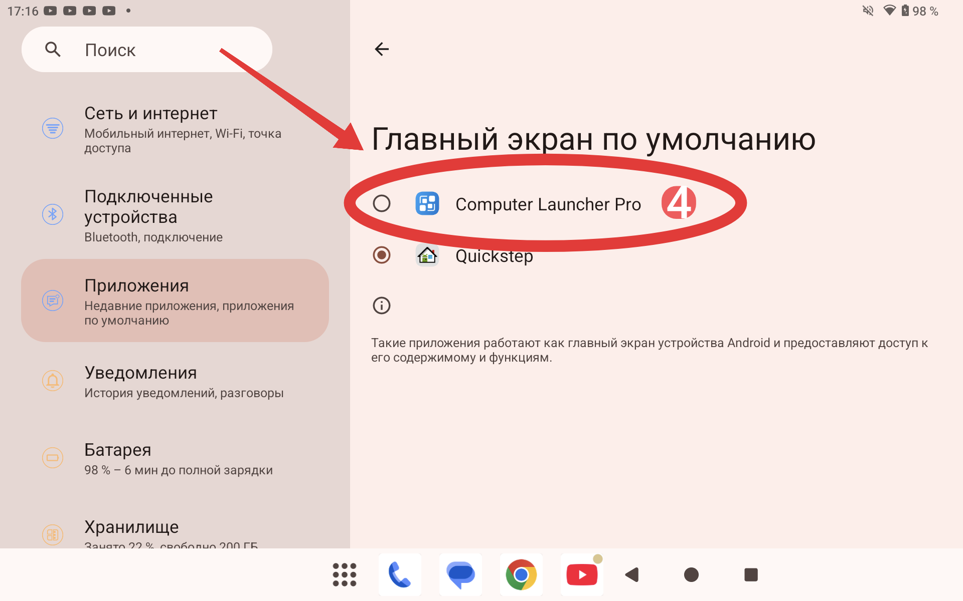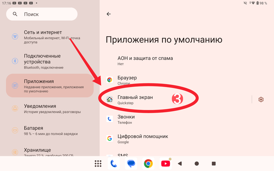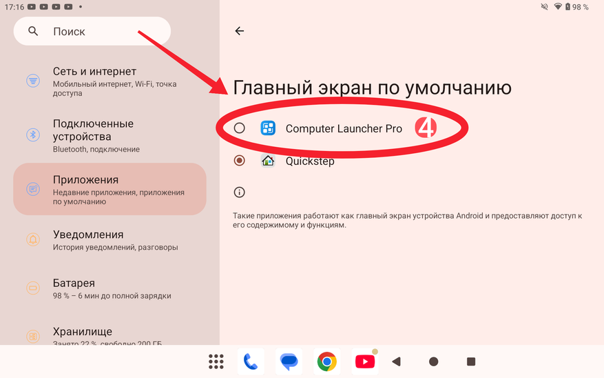 Затем переходим в настройки планшета и выбираем подраздел «Приложения», а затем подраздел «Приложения по умолчанию». В нем кликаем на пункт «Главный экран». Ну и напоследок вместо «Quickstep» выбираем ранее скачанный Computer Launcher Pro.