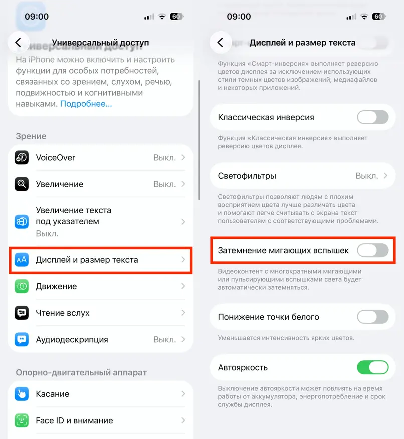 Настройки → Универсальный доступ → Дисплей и размер текста → Затемнение мигающих вспышек.