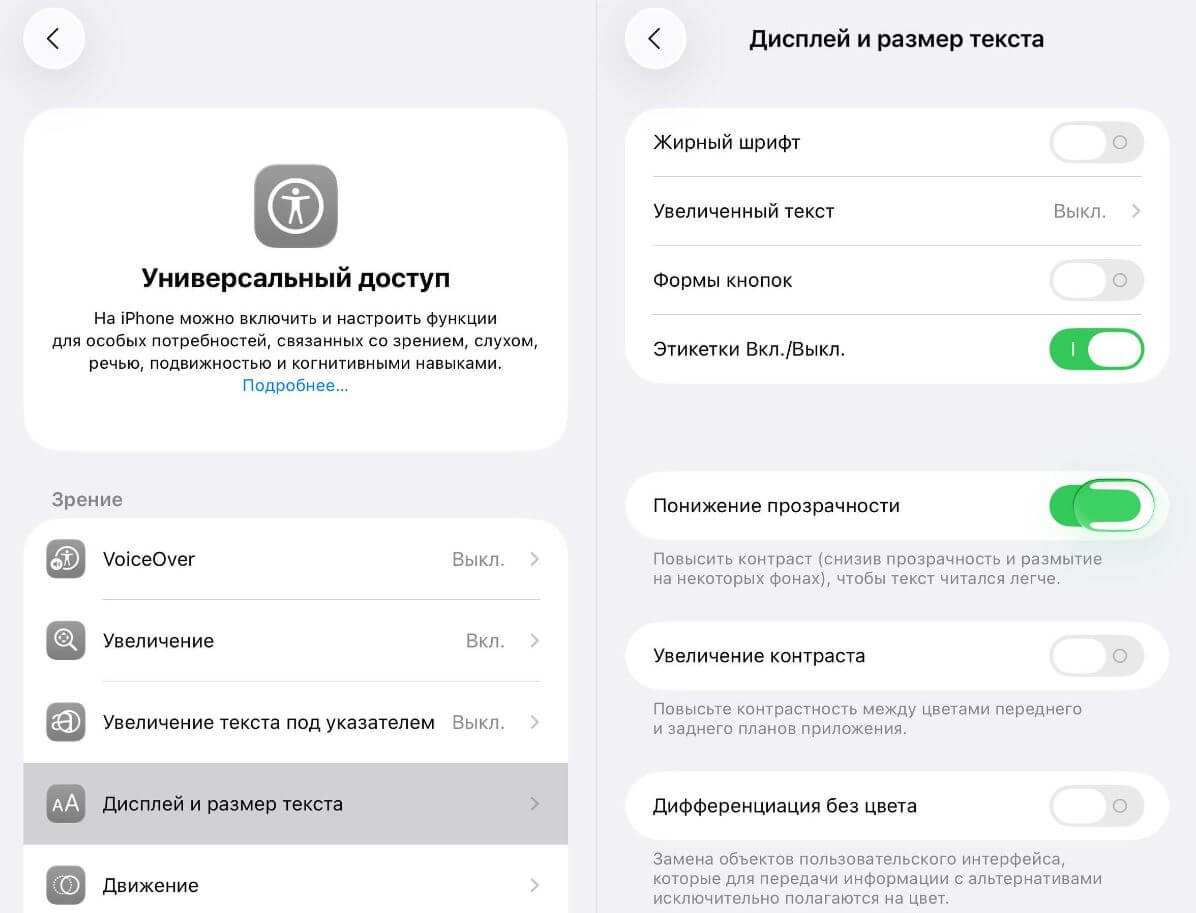 Идём по шагам. Откройте «Настройки», зайдите в «Универсальный доступ», далее «Дисплей и размер текста» и включите «Понижение прозрачности». Интерфейс станет более плотным и контрастным. Панели, виджеты, Пункт управления и всплывающие меню перестанут просвечивать фон, надписи читаются заметно легче. В штатных приложениях это работает сразу, а в сторонних всё зависит от разработчиков.