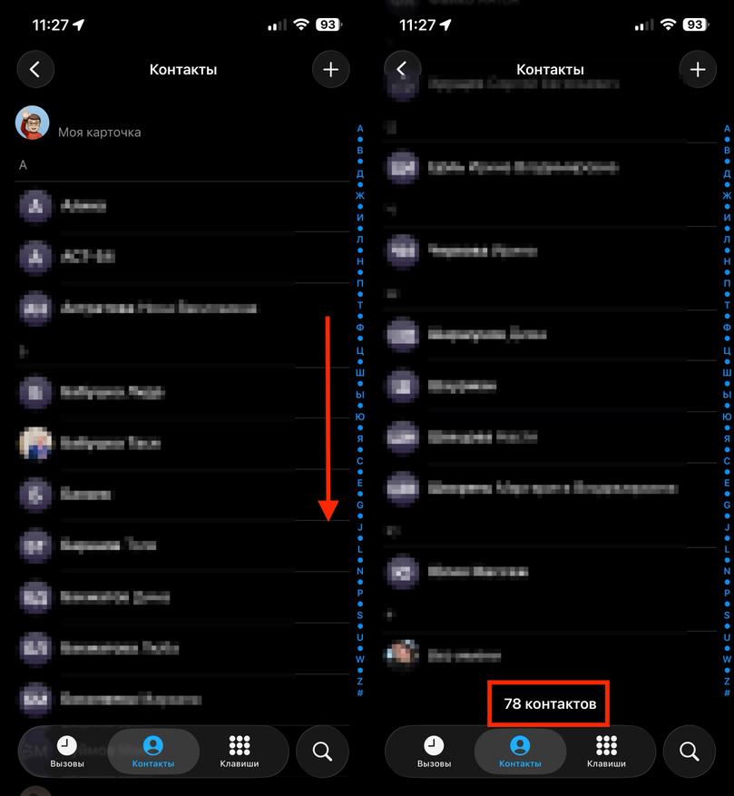 Внизу маленькой строкой будет написано, сколько контактов всего сохранено на вашем iPhone. Цифра учитывает и iCloud, и Google, и другие подключённые сервисы, если они синхронизируют телефонную книгу.