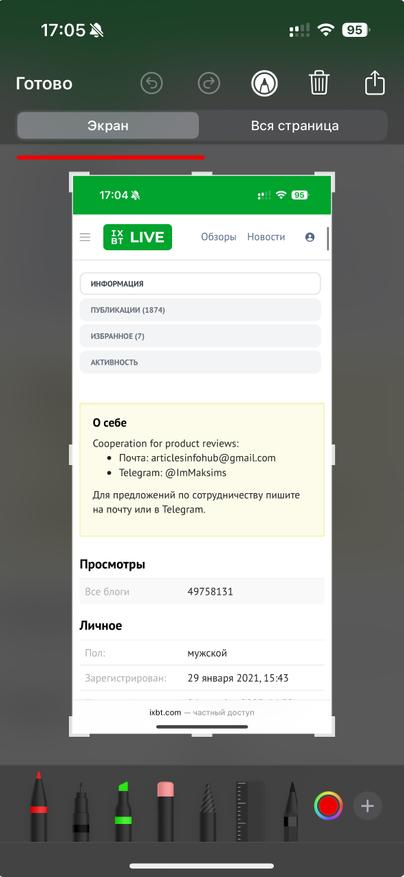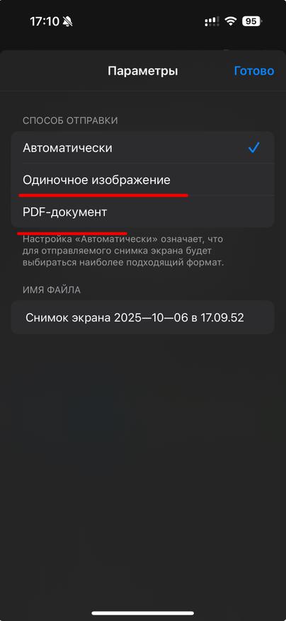 И совет от себя. Перед скриншотом можно включить в Safari «Режим чтения» через кнопку «аА» в адресной строке. Он убирает рекламу и лишние блоки, текст становится чище, а PDF компактнее. И ещё добавлю, что ширина и масштаб страницы влияют на итоговый документ. Если нужно меньше листов и крупнее шрифт, тогда увеличьте масштаб жестом или поверните iPhone горизонтально, а потом только сделайте длинный скриншот.