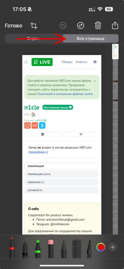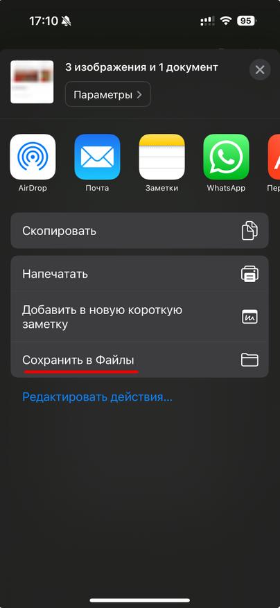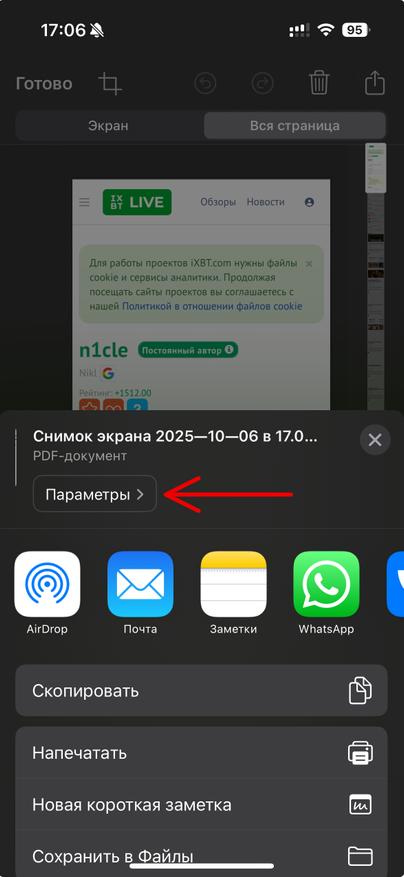 В других браузерах и приложениях вкладки «Вся страница» может не быть — это нормально. Обходной путь: в меню «Поделиться» выберите «Печать», раздвиньте превью двумя пальцами и сохраните получившийся лист как PDF в «Файлы».