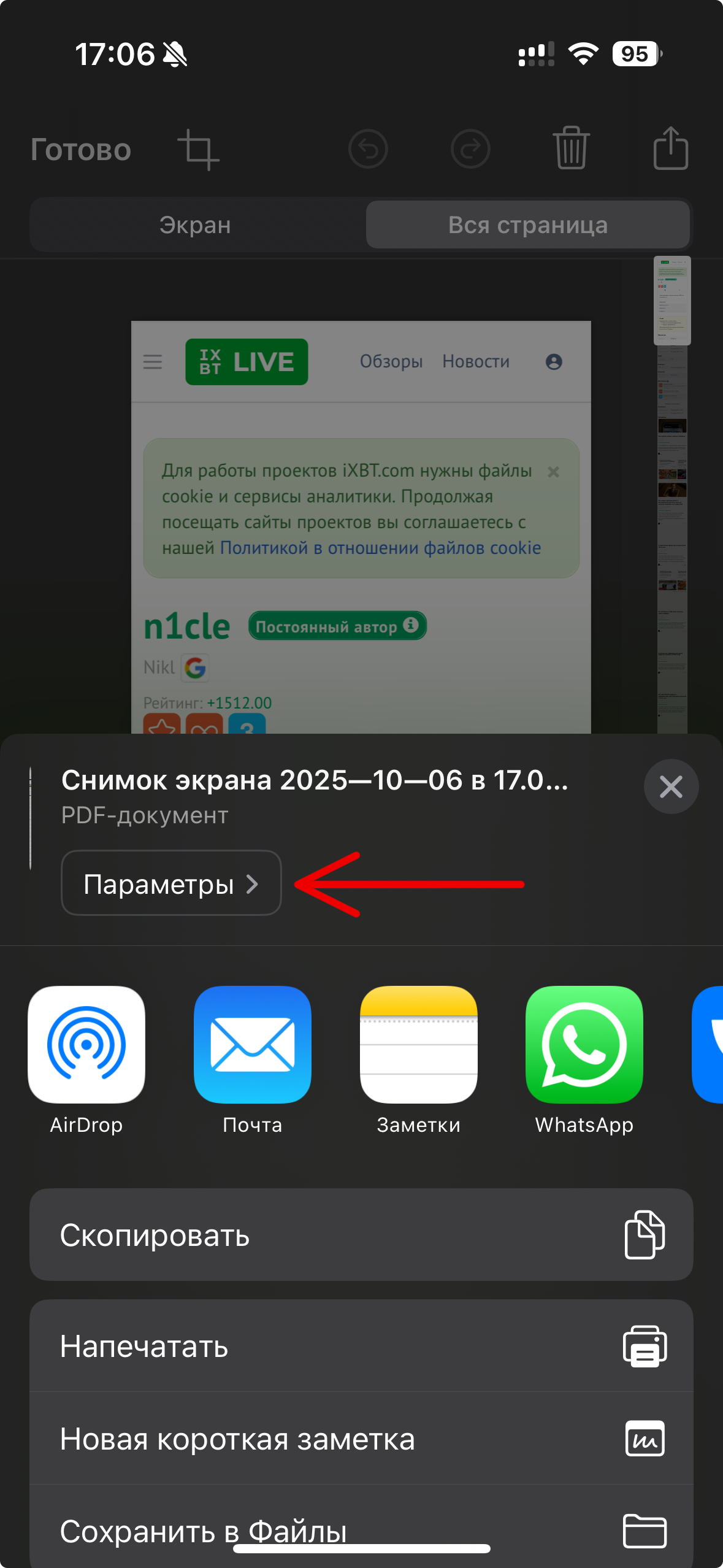 Перейдите в «Вся страница», при необходимости прокрутите предпросмотр справа и обрежьте лишнее. Нажмите «Готово» и сохраните как PDF в «Файлы». Там его легко переслать, распечатать или открыть на компьютере.