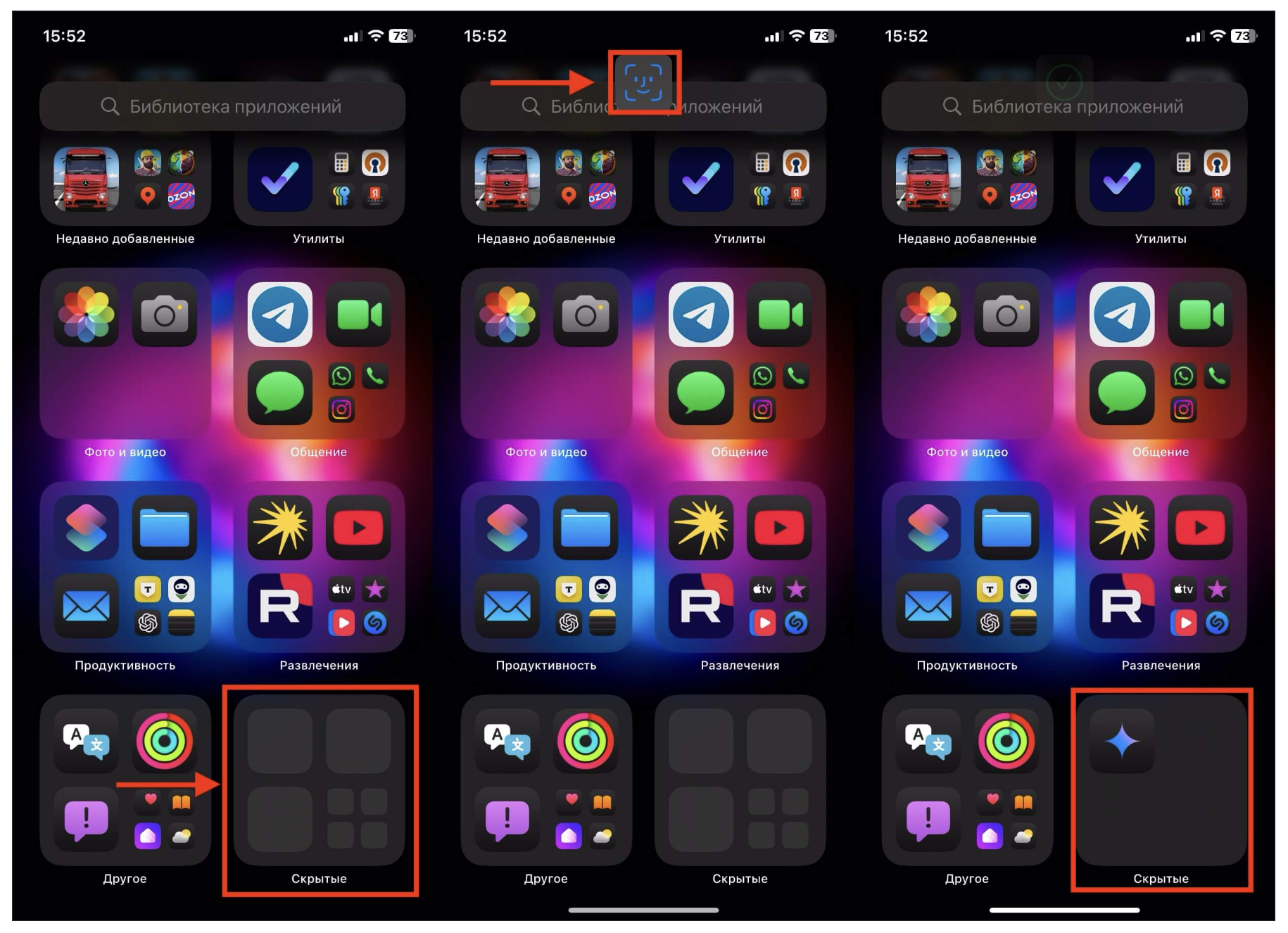 Доступ к этой папке открыт только после подтверждения Fаce ID / Touch ID. Без биометрии папка не откроется, и запустить спрятанные приложения не получится. Любая программа, которую вы скрыли описанным способом, окажется именно здесь и больше нигде.